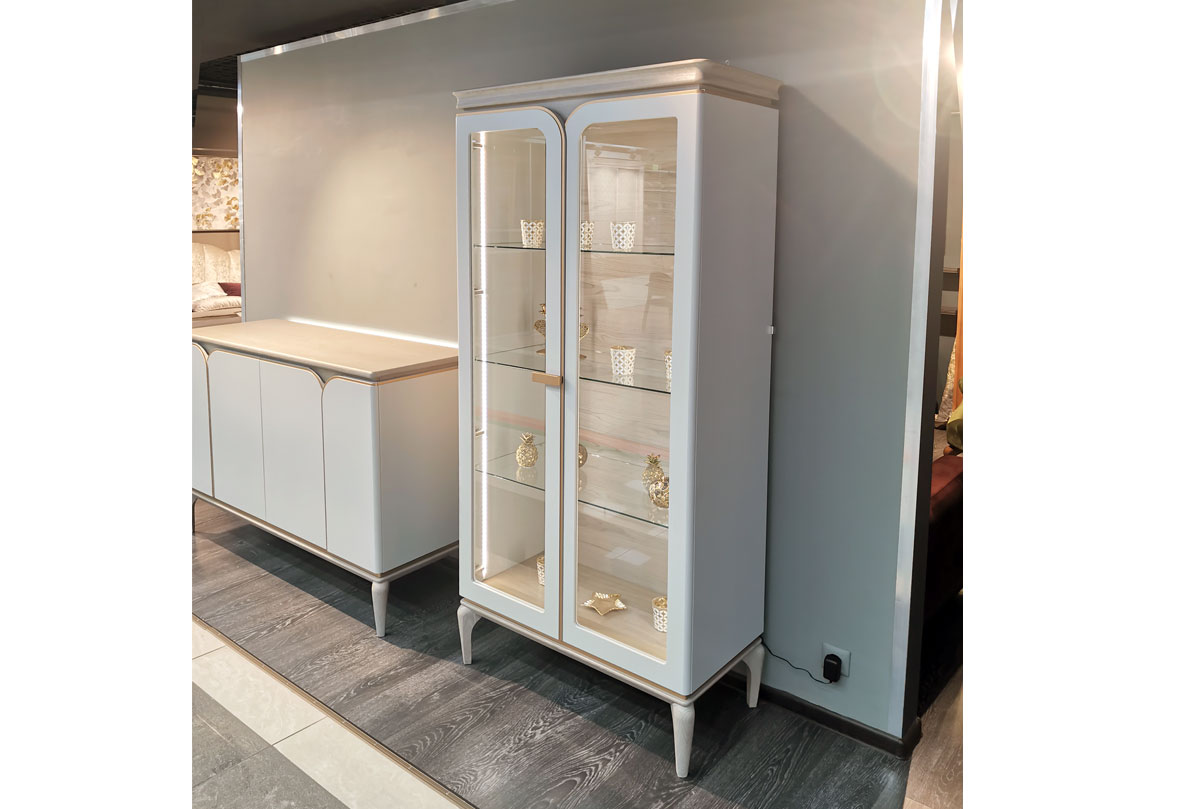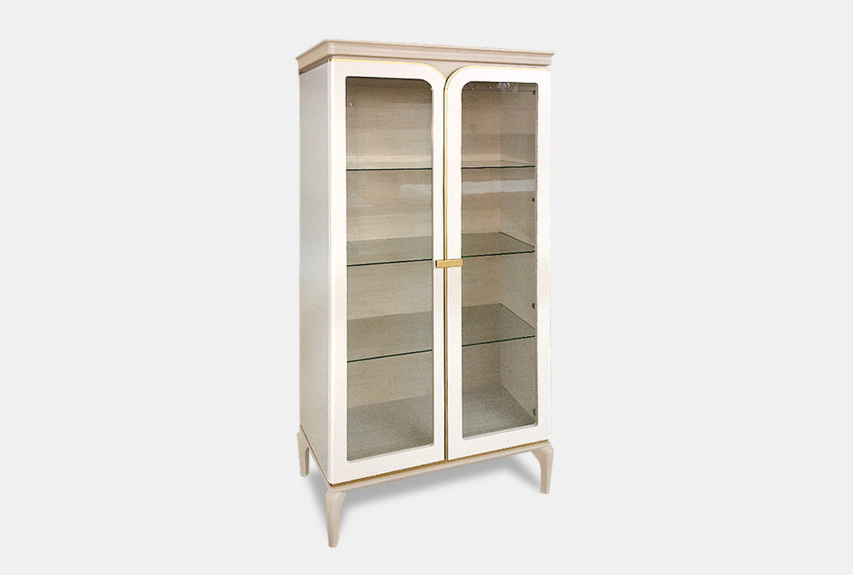 Двухдверный шкаф с витриной «Алекса» в цвете "айвори+жемчужный дуб, золотая патина" изысканный представитель неоклассики. Он станет идеальной мебелью для любой гостиной. Благодаря деликатной светодиодной подсветке в сочетании с сатиновым покрытием и золотой окантовкой, двухдверный шкаф излучает сияние и легкость. На стеклянных полках удобно разместятся любимые сервизы, сувениры, рамки с фотографиями или даже книги.