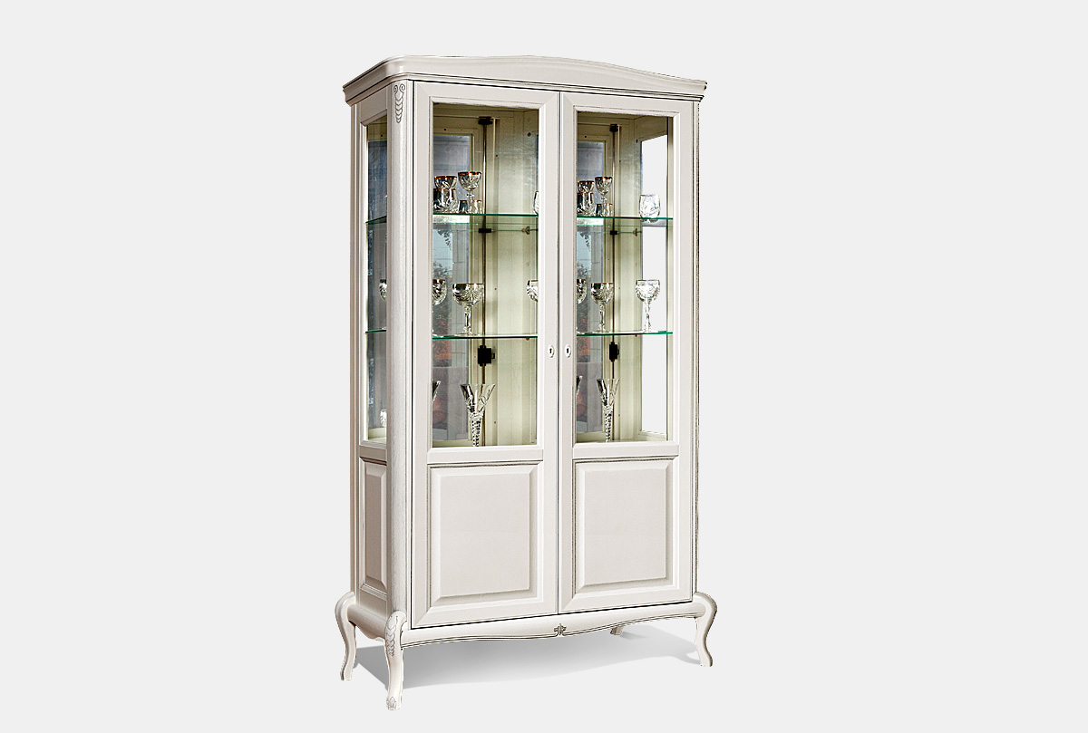 Двухдверная витрина из коллекции «Fleuron» — это утонченная роскошь для любителей прекрасного. Такие элементы шкафа, как стеклянные двери в сочетании с фигурными ножками, придадут неповторимый интерьер Вашей гостиной.