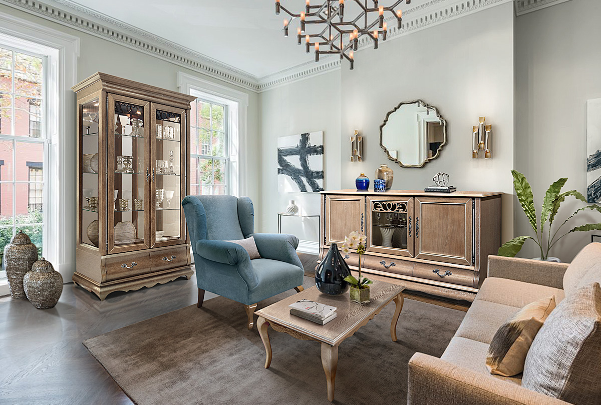 Изысканный вкус хозяев подчеркнет двухдверный шкаф с витриной «Тэфи». Этому элементу интерьера просто уготовано украсить гостиную или столовую. На его полках будет хорошо смотреться как дорогая фарфоровая посуда, так и вновь вошедший в моду хрусталь. А плотно закрывающаяся на ключ дверь защитит посуду от пыли. Для изготовления шкафа используется ценная порода дерева, а именно массив дуба. Деревянная накладная резьба продемонстрирует на стекле изящно прорисованные линии. Цвет можно выбрать по своему вкусу: «белая эмаль с темной патиной» привнесёт элегантность, «классик» добавит нотки классицизма, а «амбэр с белой патиной» подарит оригинальность.