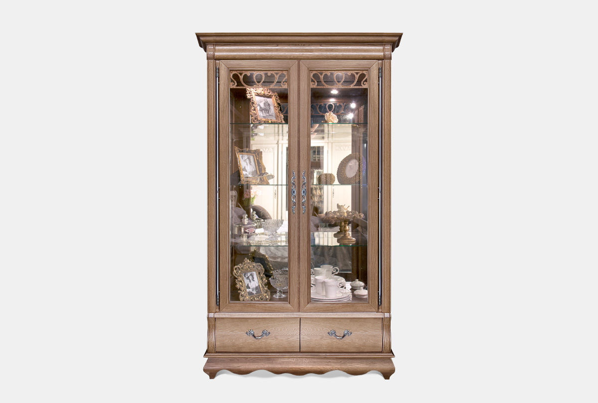 Изысканный вкус хозяев подчеркнет двухдверный шкаф с витриной «Тэфи». Этому элементу интерьера просто уготовано украсить гостиную или столовую. На его полках будет хорошо смотреться как дорогая фарфоровая посуда, так и вновь вошедший в моду хрусталь. А плотно закрывающаяся на ключ дверь защитит посуду от пыли. Для изготовления шкафа используется ценная порода дерева, а именно массив дуба. Деревянная накладная резьба продемонстрирует на стекле изящно прорисованные линии. Цвет можно выбрать по своему вкусу: «белая эмаль с темной патиной» привнесёт элегантность, «классик» добавит нотки классицизма, а «амбэр с белой патиной» подарит оригинальность.