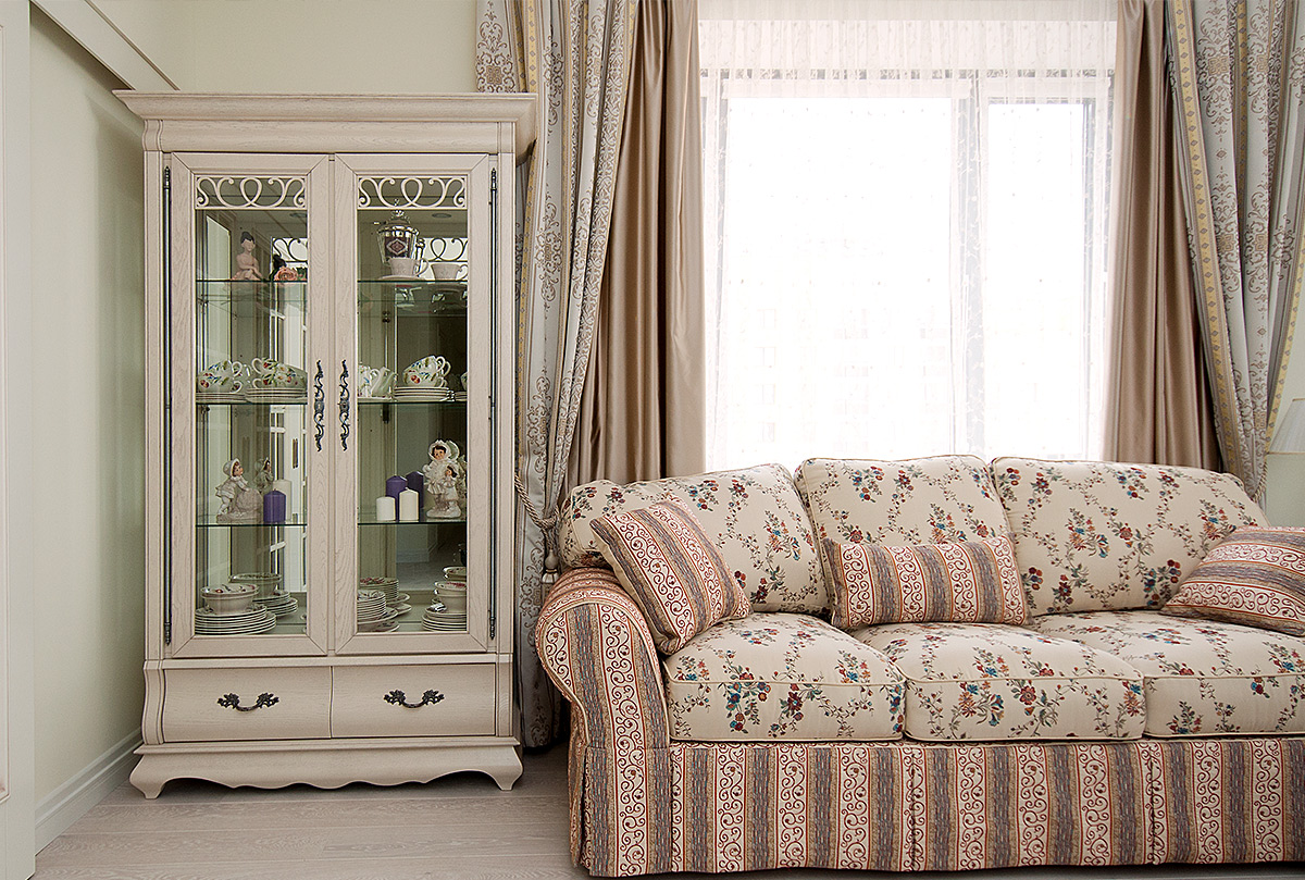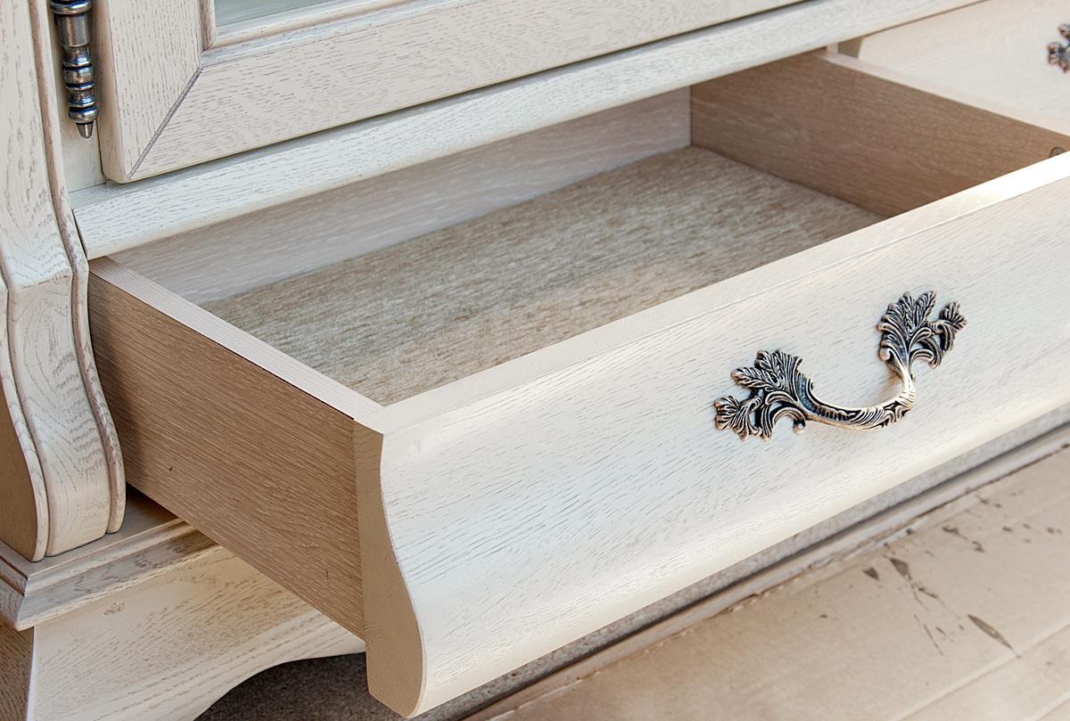 Изысканный вкус хозяев подчеркнет двухдверный шкаф с витриной «Тэфи». Этому элементу интерьера просто уготовано украсить гостиную или столовую. На его полках будет хорошо смотреться как дорогая фарфоровая посуда, так и вновь вошедший в моду хрусталь. А плотно закрывающаяся на ключ дверь защитит посуду от пыли. Для изготовления шкафа используется ценная порода дерева, а именно массив дуба. Деревянная накладная резьба продемонстрирует на стекле изящно прорисованные линии. Цвет можно выбрать по своему вкусу: «белая эмаль с темной патиной» привнесёт элегантность, «классик» добавит нотки классицизма, а «амбэр с белой патиной» подарит оригинальность.