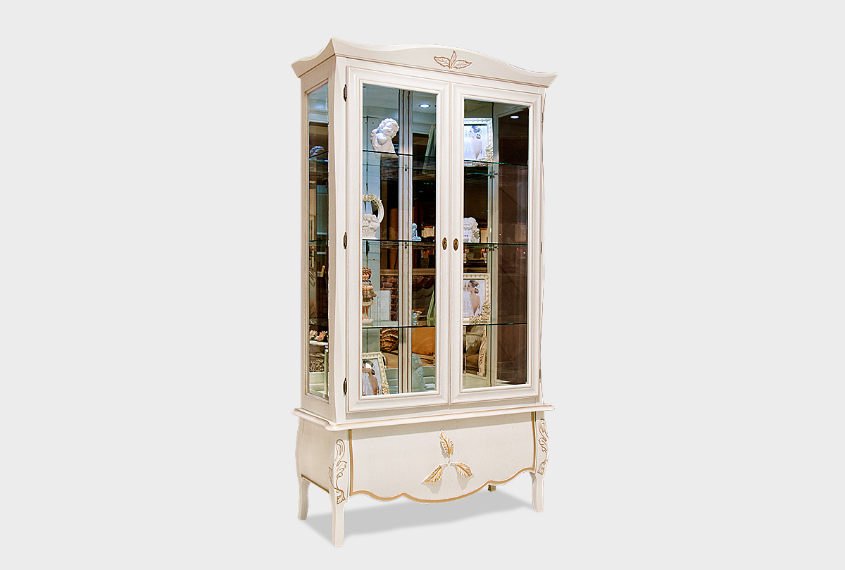Двухдверный шкаф с витриной из коллекции «Трио» в цвете «белая эмаль с золотой патиной» порадует любителей основательных и массивных форм, но в то же время – изящества и декоративности. Изделие идеально сочетает в себе эстетику и практичность и идеально впишется как в гостиную, так и в столовую. В шкафу Вы можете хранить посуду, сувениры, расставить рамки с фотографиями или книги. Он оснащен подсветкой, которая красиво отражается в зеркальной задней поверхности, а стеклянные боковые стенки дополняют образ и делают его более легким и изящным.