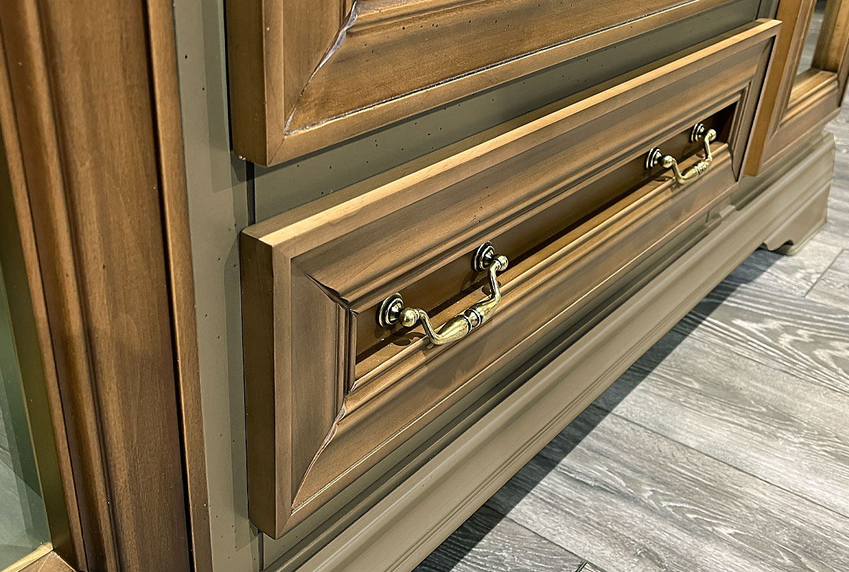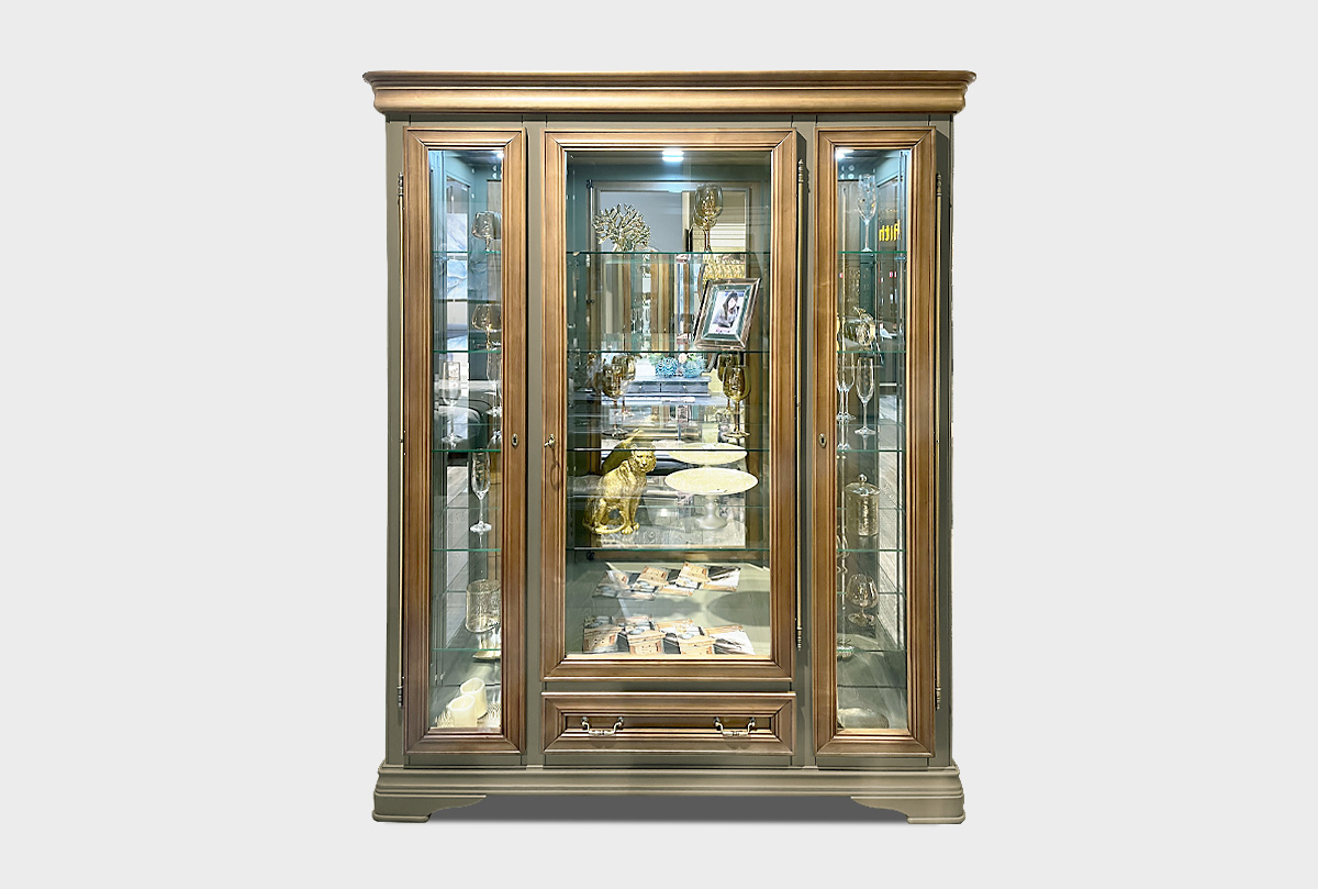 Трехдверный шкаф с витриной «Оливия» в цвете «олива» станет изысканным украшением любой гостиной или столовой. Стеклянные фасады в сочетании с зеркальной задней стенкой создадут непревзойденную игру света. Для изготовления шкафа-витрины используется массив и шпон ольхи, он отлично справляется с созданием теплой и уютной атмосферы в любом помещении.