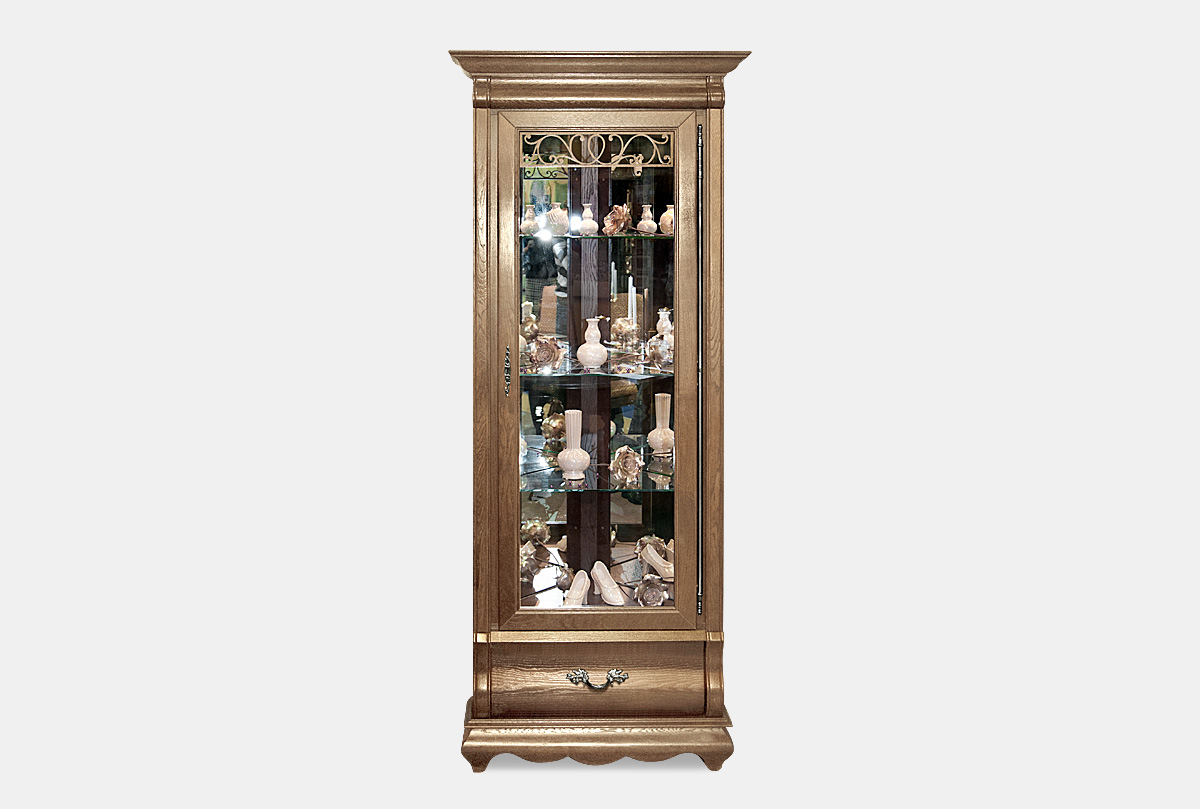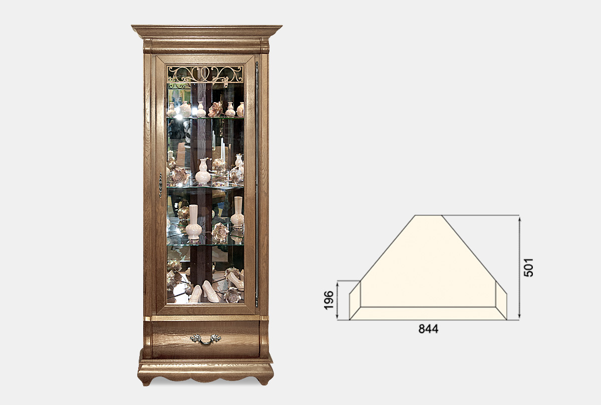 Угловой шкаф с витриной «Тэфи» прекрасно впишется в интерьер комнаты. Изысканность массива дуба подчеркнет строгую симметрию классических форм. После заполнения витрин великолепной посудой и предметами искусства можно любоваться их красотой, благодаря внутренней подсветке. Дно и стенки ящика отделаны приятным на ощупь велюром. Взгляд останавливается на классическом орнаменте изящных металлических ручек итальянского производства, а бесшумное закрывание ящиков говорит об австрийском качестве.