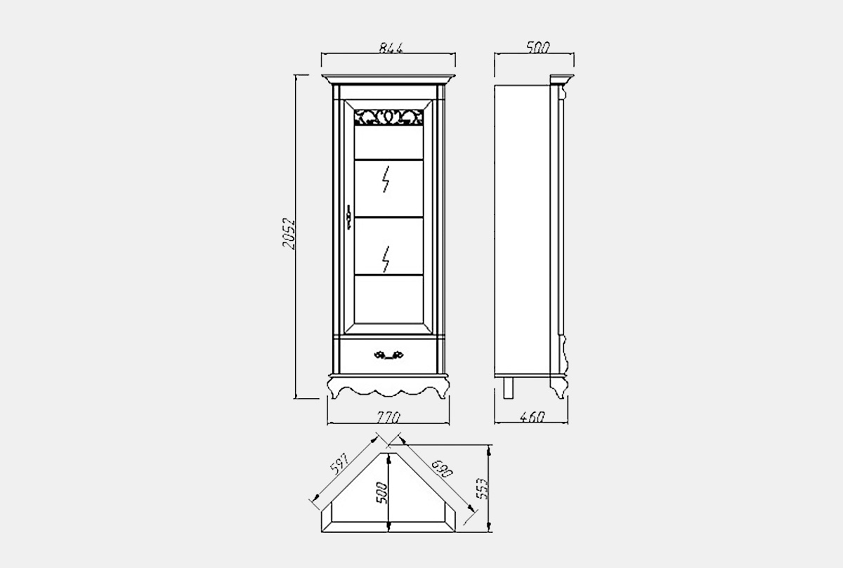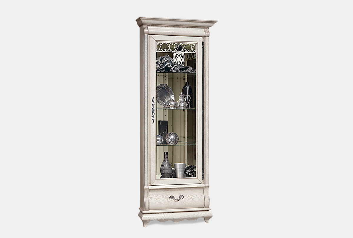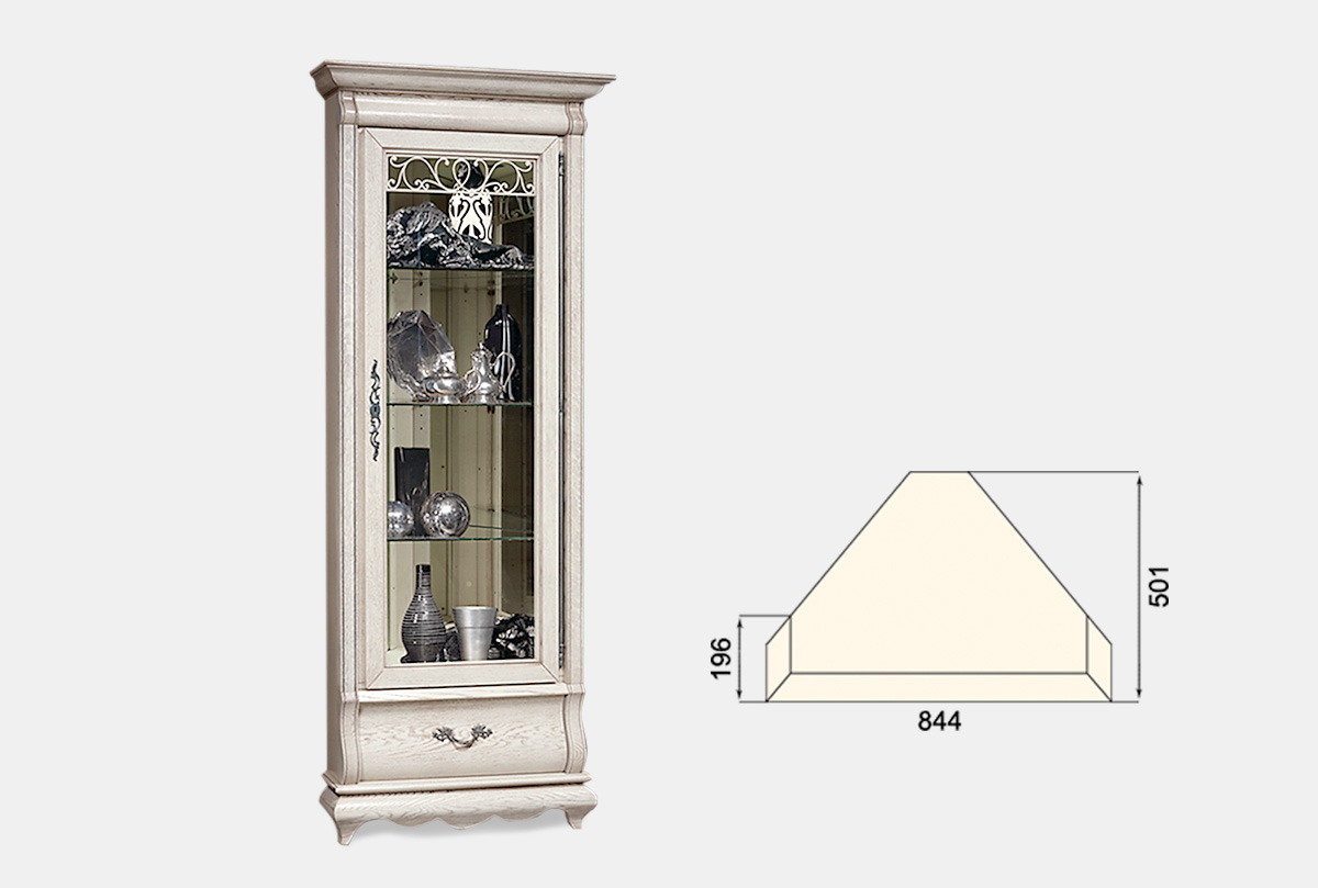 Угловой шкаф с витриной «Тэфи» прекрасно впишется в интерьер комнаты. Изысканность массива дуба подчеркнет строгую симметрию классических форм. После заполнения витрин великолепной посудой и предметами искусства можно любоваться их красотой, благодаря внутренней подсветке. Дно и стенки ящика отделаны приятным на ощупь велюром. Взгляд останавливается на классическом орнаменте изящных металлических ручек итальянского производства, а бесшумное закрывание ящиков говорит об австрийском качестве.