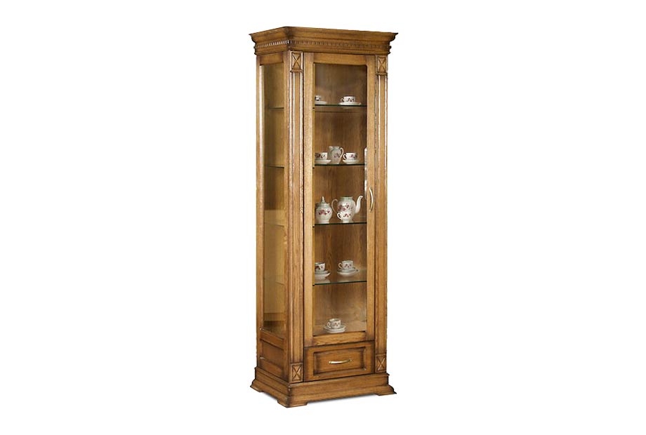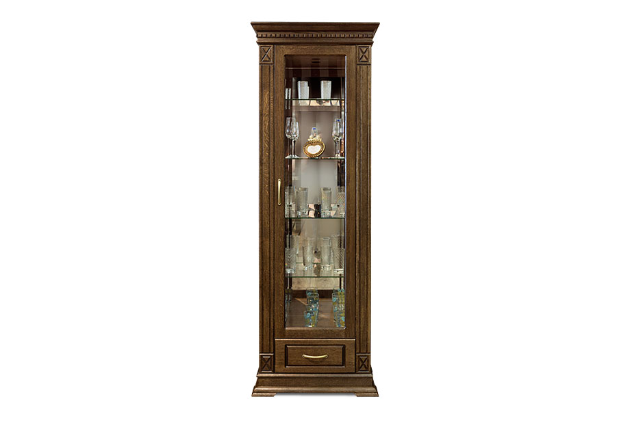 Идеальным дополнением к гостиной, меблированной в классическом стиле, станет однодверный шкаф с витриной из коллекции «Верди Люкс». Несмотря на свою массивность и основательность, этот предмет мебели не займет много места в Вашей комнате, а только лишь, наоборот, станет ее украшением и изюминкой. Благородные цвета крашения вкупе с зеркальными полками и задней зеркальной поверхностью шкафа подчеркивают изысканность, свойственную классическому стилю, а декоративная резьба на пилястрах и фигурный цоколь придают шкафу утонченности и «воздушности». Вместительный выдвижной ящик делает его не только красивым, но и функциональным.