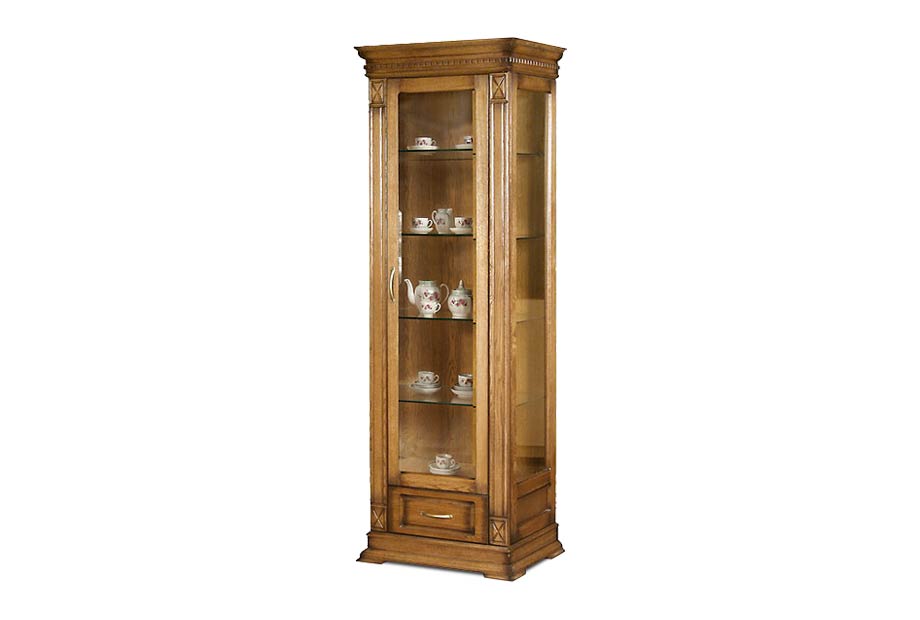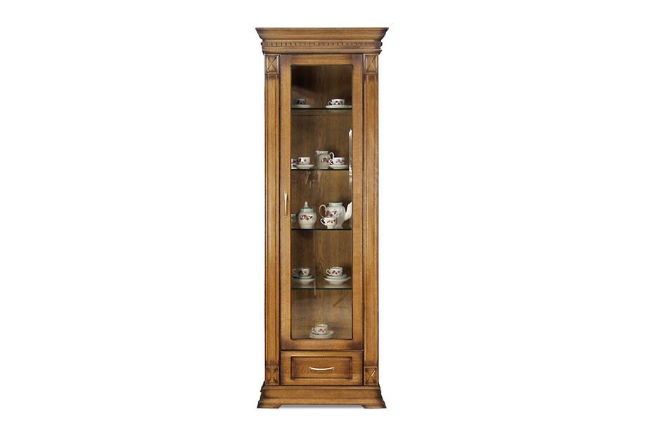 Идеальным дополнением к гостиной, меблированной в классическом стиле, станет однодверный шкаф с витриной из коллекции «Верди Люкс». Несмотря на свою массивность и основательность, этот предмет мебели не займет много места в Вашей комнате, а только лишь, наоборот, станет ее украшением и изюминкой. Благородные цвета крашения вкупе с зеркальными полками и задней зеркальной поверхностью шкафа подчеркивают изысканность, свойственную классическому стилю, а декоративная резьба на пилястрах и фигурный цоколь придают шкафу утонченности и «воздушности». Вместительный выдвижной ящик делает его не только красивым, но и функциональным.