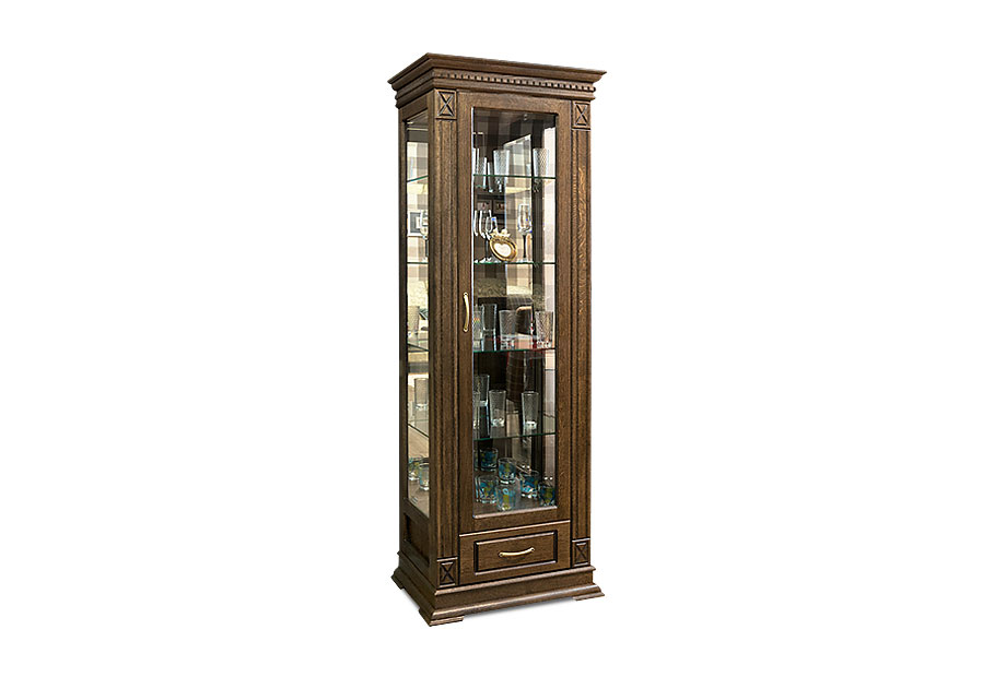 Идеальным дополнением к гостиной, меблированной в классическом стиле, станет однодверный шкаф с витриной из коллекции «Верди Люкс». Несмотря на свою массивность и основательность, этот предмет мебели не займет много места в Вашей комнате, а только лишь, наоборот, станет ее украшением и изюминкой. Благородные цвета крашения вкупе с зеркальными полками и задней зеркальной поверхностью шкафа подчеркивают изысканность, свойственную классическому стилю, а декоративная резьба на пилястрах и фигурный цоколь придают шкафу утонченности и «воздушности». Вместительный выдвижной ящик делает его не только красивым, но и функциональным.