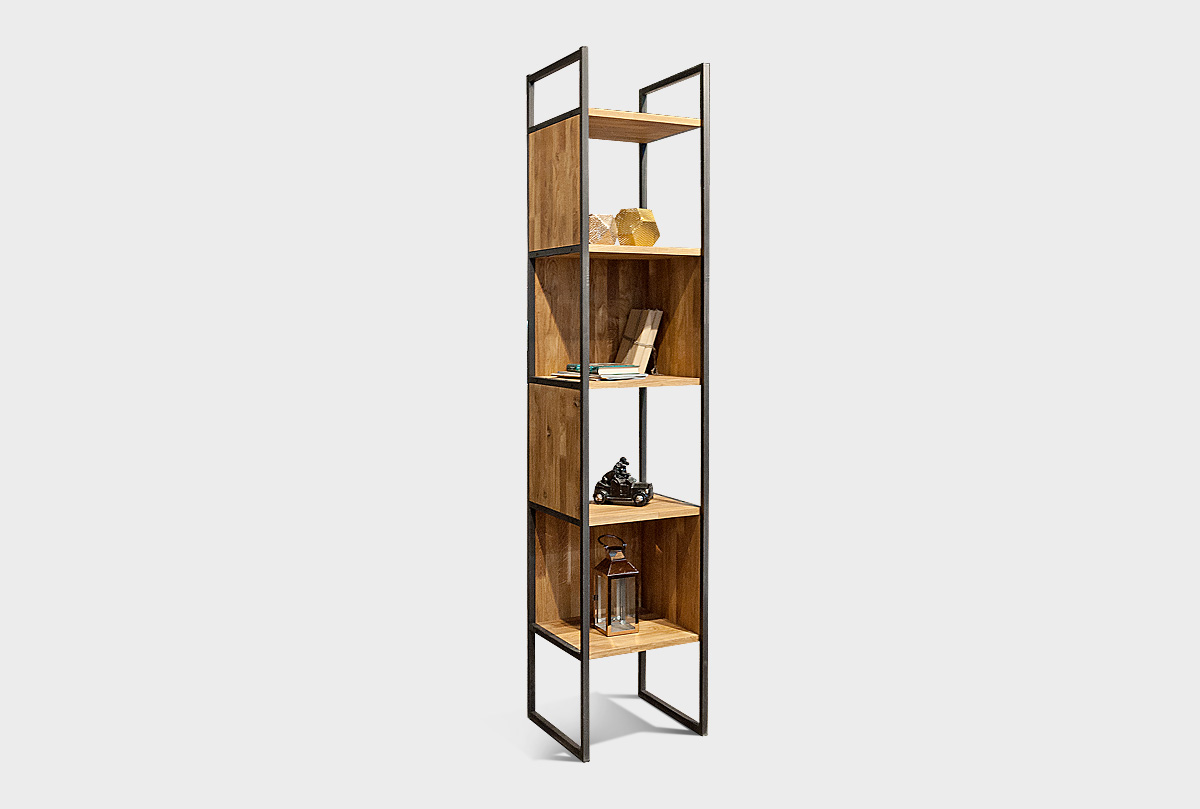 Узкий четырёхсекционный стеллаж Art Collection («Арт Коллекшен») 420 в цвете «бейц-масло, чёрный металл» - уникальная мебель для Вашей гостиной в стиле Лофт. Изготовлен из массива дуба на металлическом каркасе.