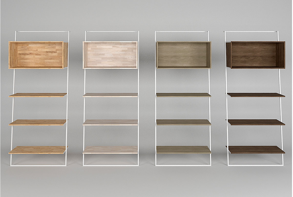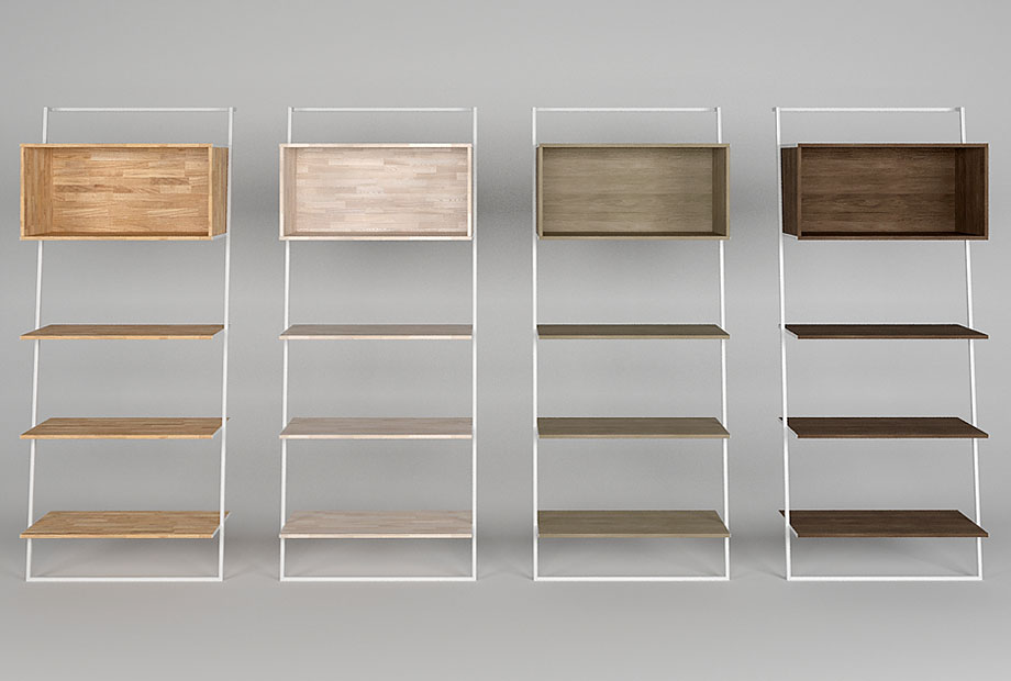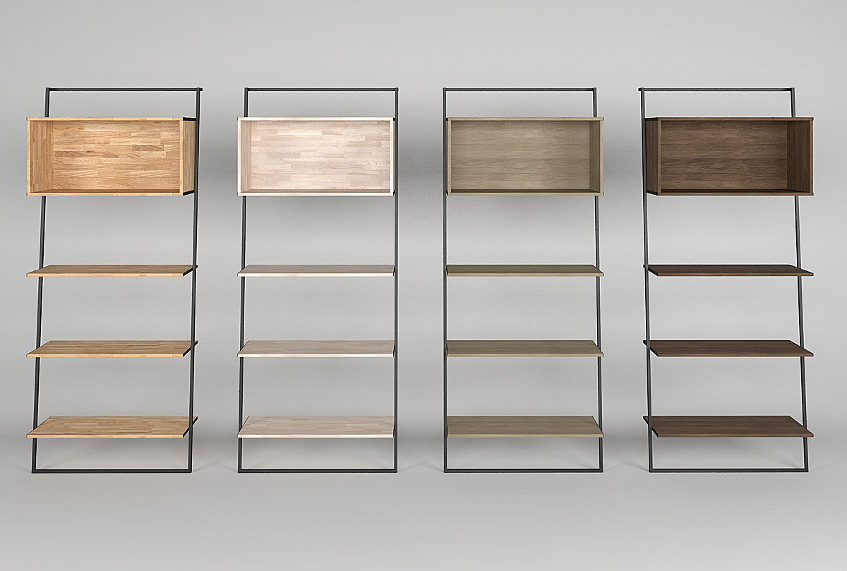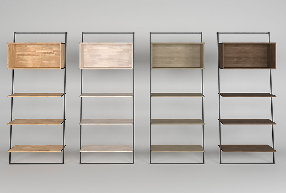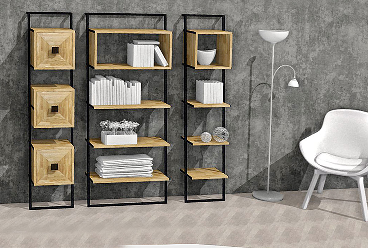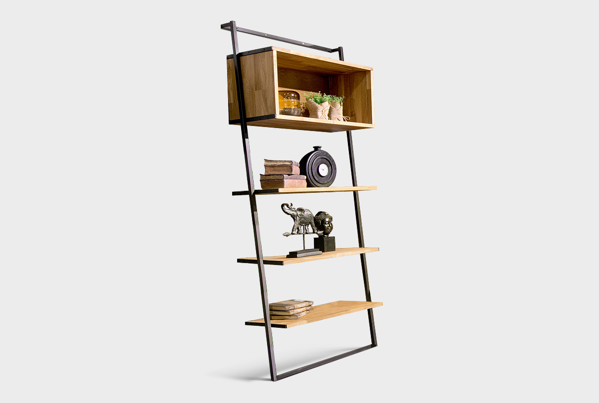 Широкий стеллаж Art Collection («Арт Коллекшен») 445 в цвете «бейц-масло, чёрный металл» с тремя полками и нишей, изготовлен из массива дуба на металлическом каркасе.