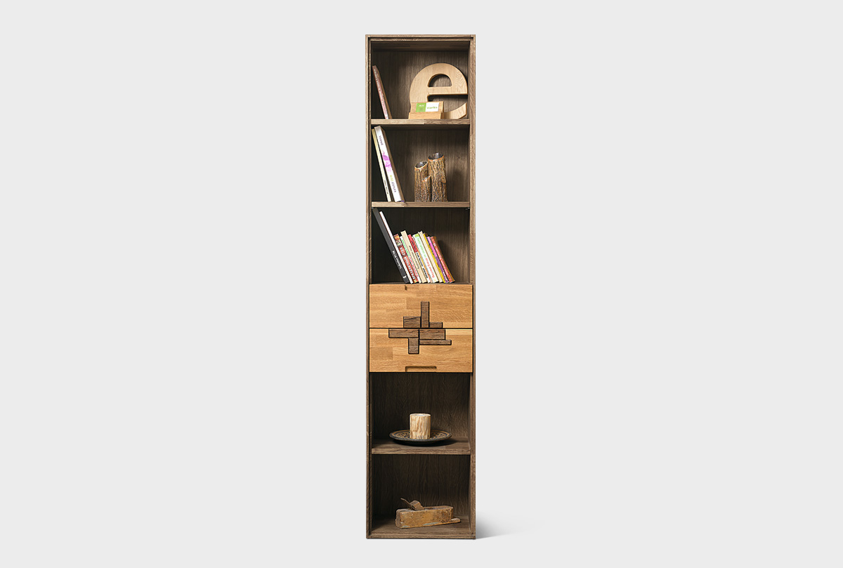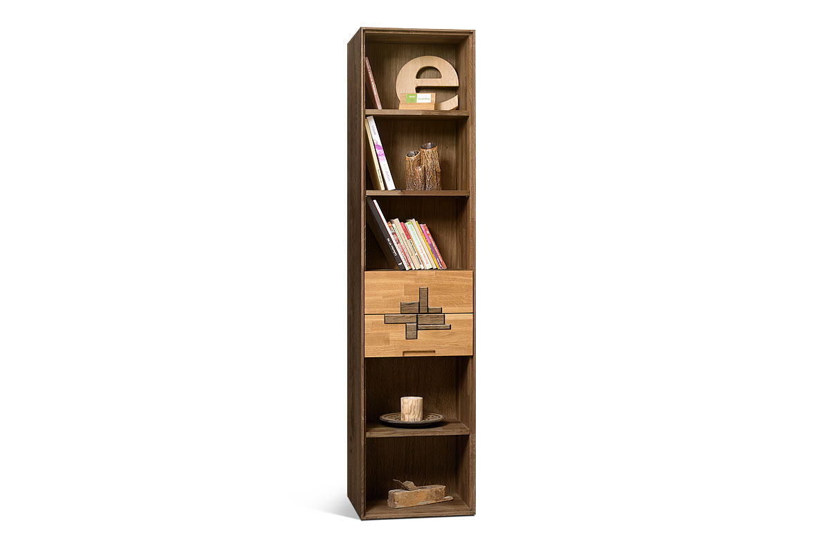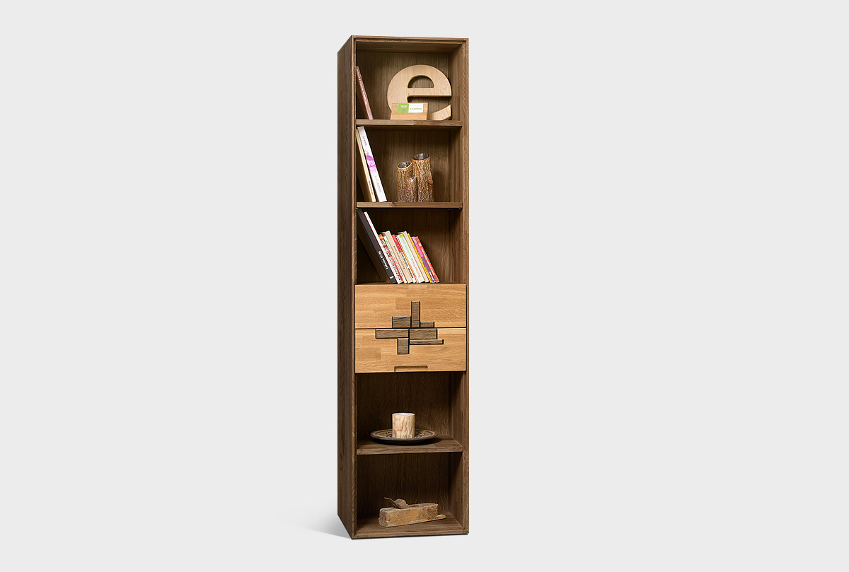 Узкий стеллаж с ящиками из коллекции Irving Design («Ирвинг дизайн») в цвете «графит, бейц-масло», изготовлен из массива дуба.