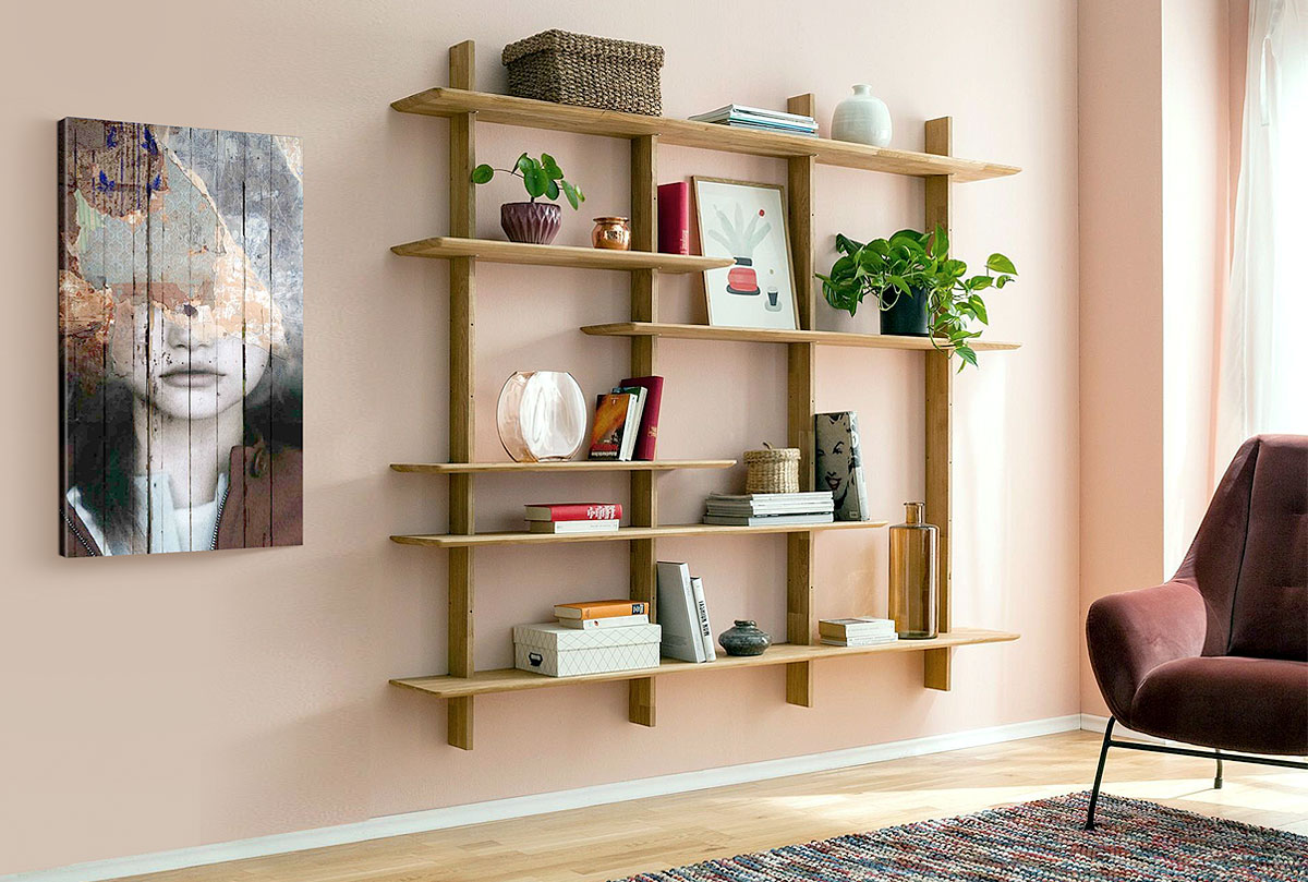 Навесной стеллаж «Art Collection» в цвете «бейц-масло» из дуба в стиле Лофт для гостиной или спальни.