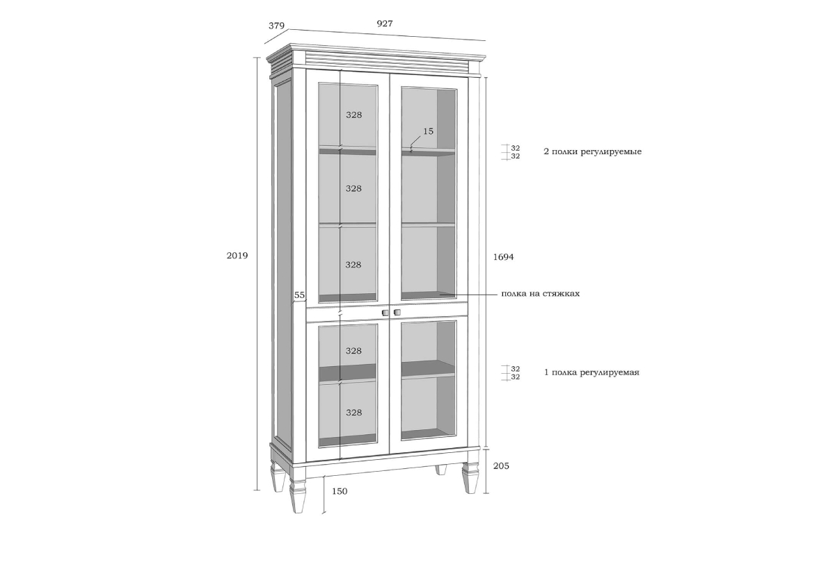 ✅ Оснащен пятью полками и распашными дверями со стеклянными вставками.