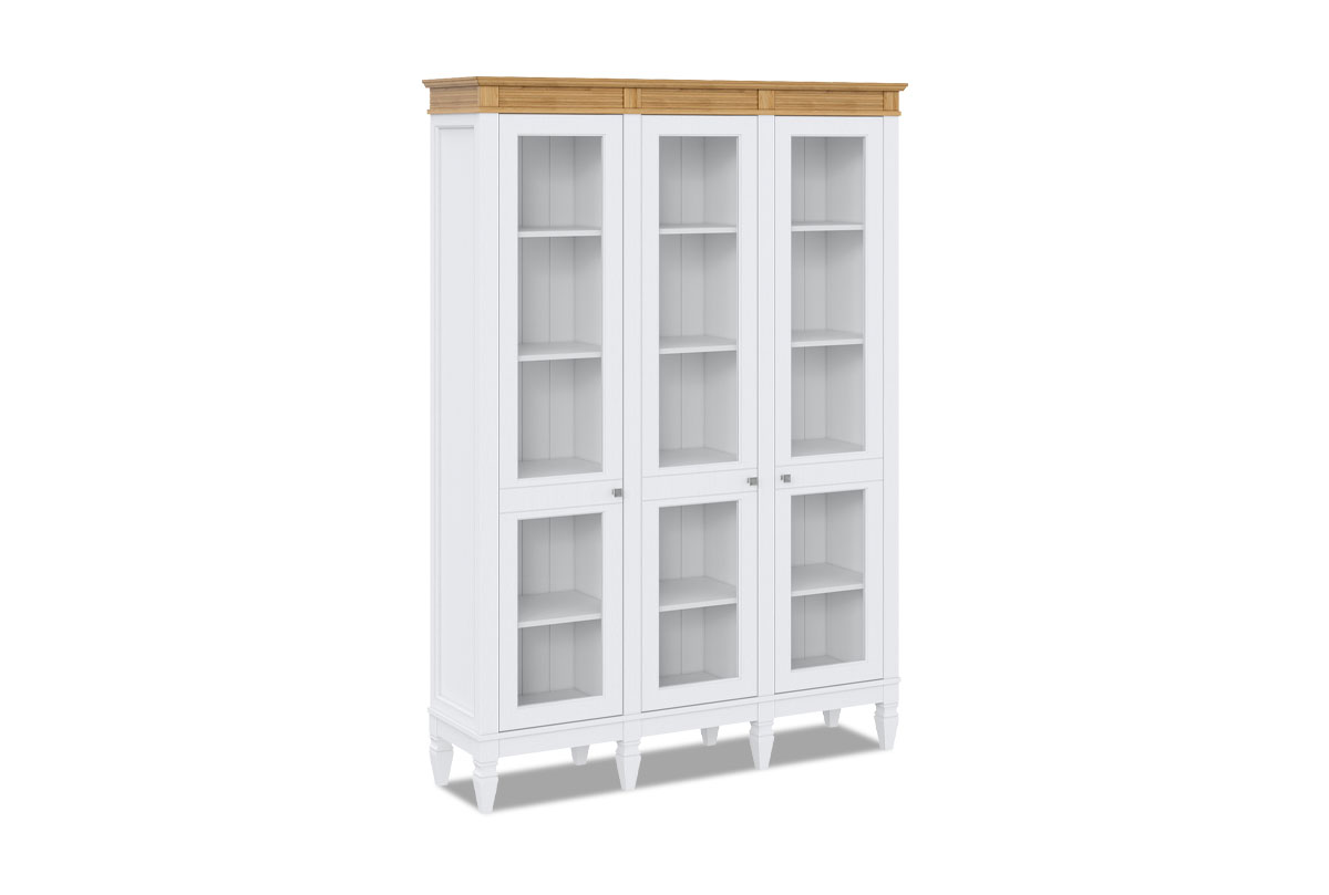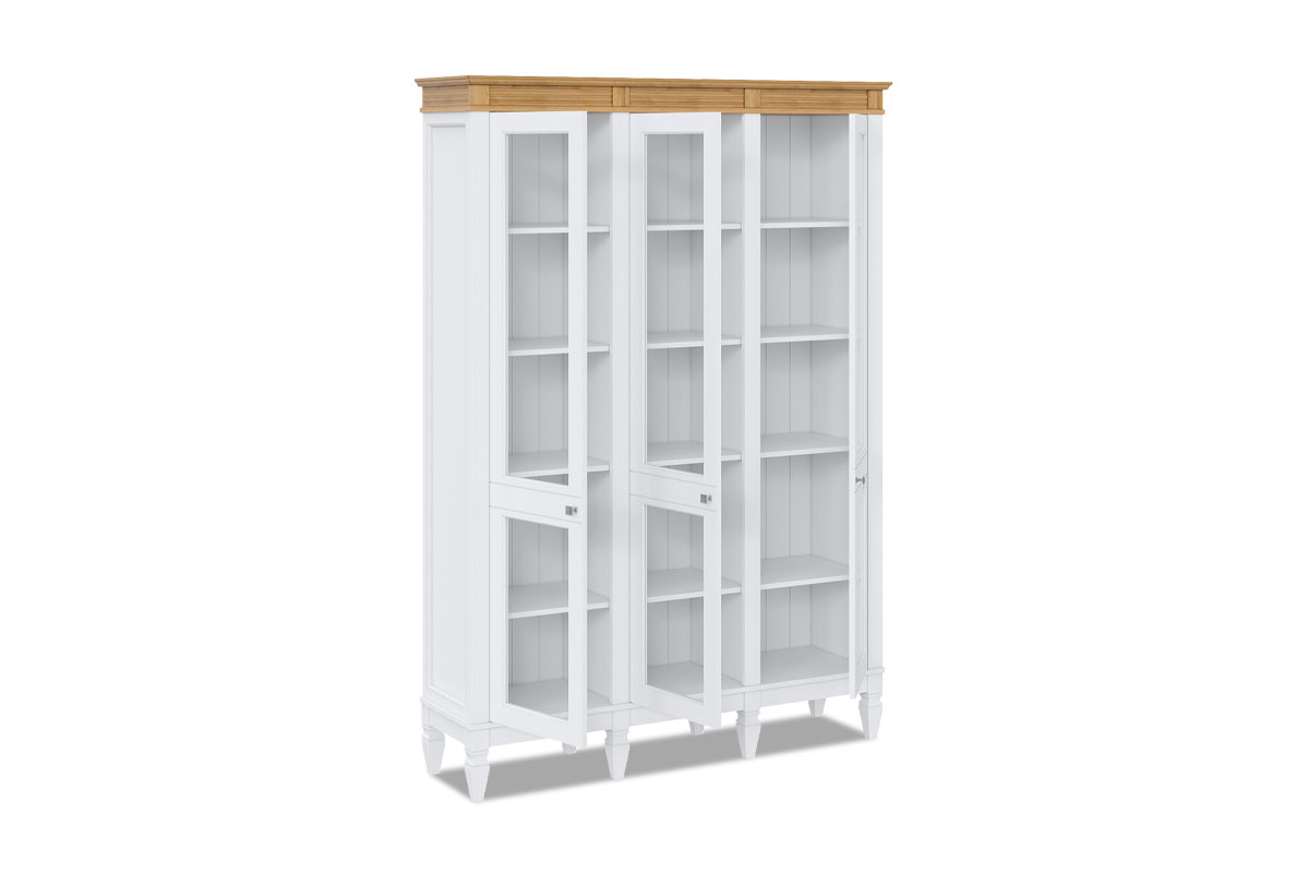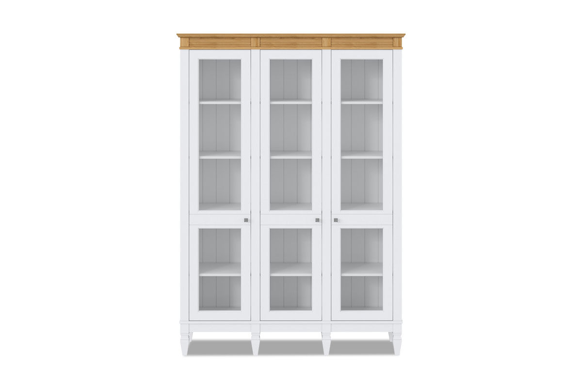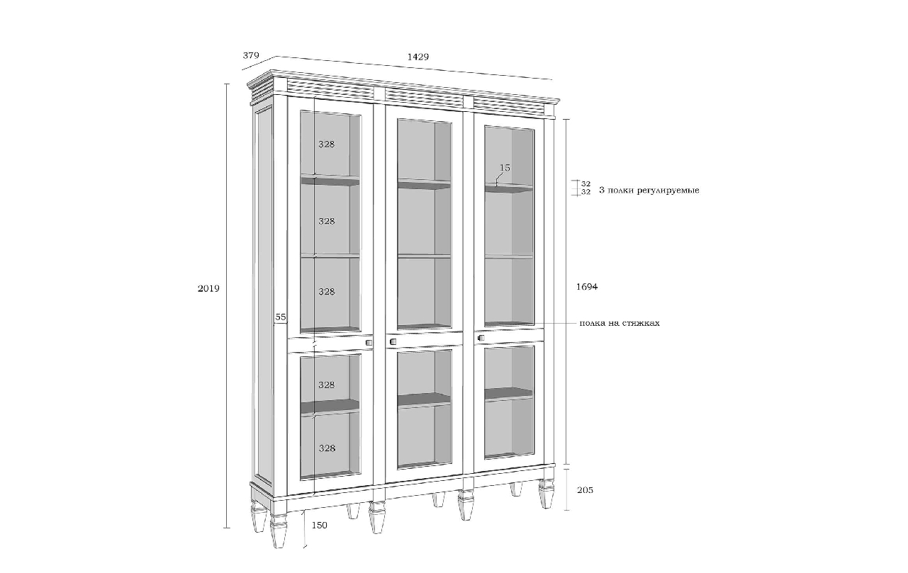 ✅ Оснащен четырьмя полками в каждой их трех секций, тремя дверями со стеклянными вставками.