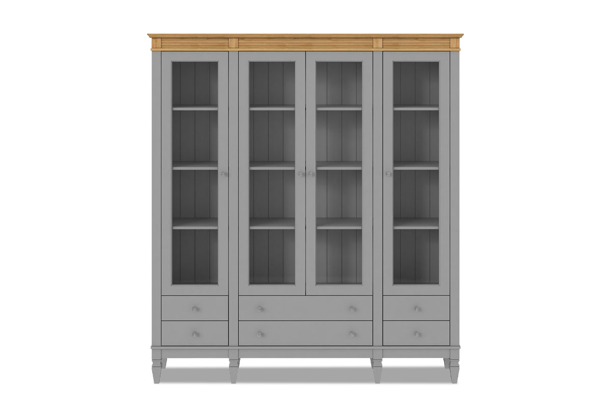 ✅ Три вертикальных секции, в каждой из которых четыре полки за стеклянными дверями, 6 ящиков.