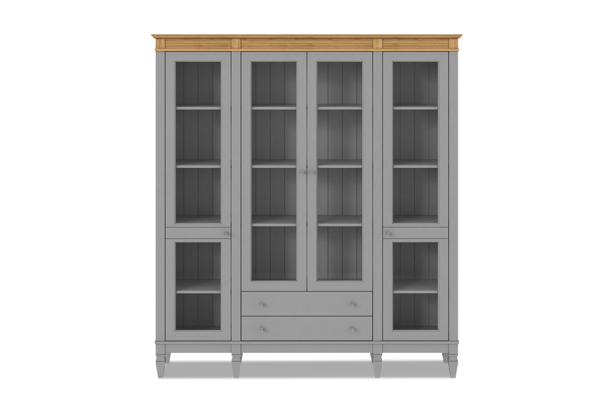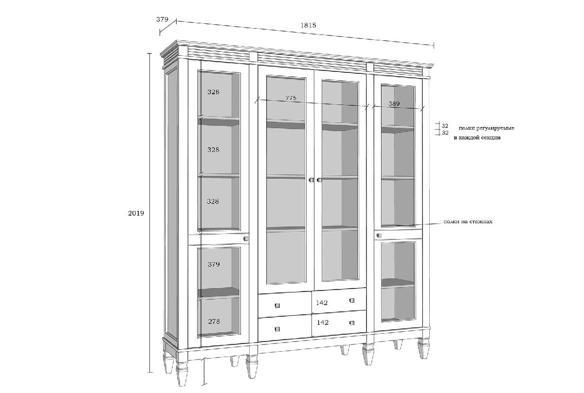 ✅ Оснащен четырьмя стеклянными, распашными дверьми и двумя широкими ящиками.