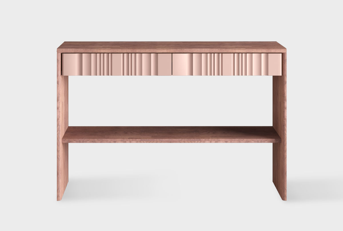 Стол - консоль «Меридиан» из дуба. Корпус изделия выполнен в цвете «шоколадный дуб», а фасад — ножка «дымчатая роза».