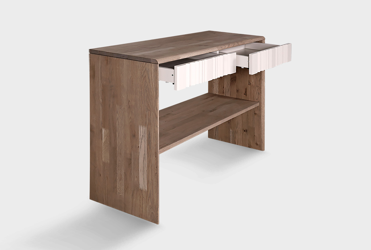 Стол - консоль «Меридиан» из дуба. Корпус изделия выполнен в цвете «торфяной дуб», а фасад — ножка «панна котта».