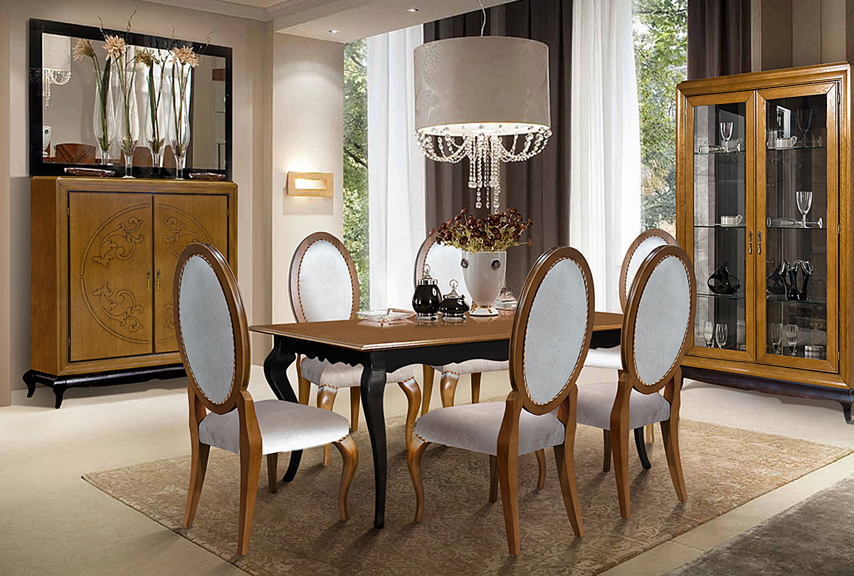 Обеденный стол входит в коллекцию классических роскошных предметов мебели «Тэфи». Классицизм тяготеет к спокойным благородным тонам, поэтому Вашим выбором может стать стол цвета «орех» или «белая эмаль с темной патиной». Благодаря изумительно красивой столешнице и изогнутым ножкам, такой обеденный стол достойно украсит столовую или гостиную и станет уютным местом для теплых душевных встреч в Вашем доме.