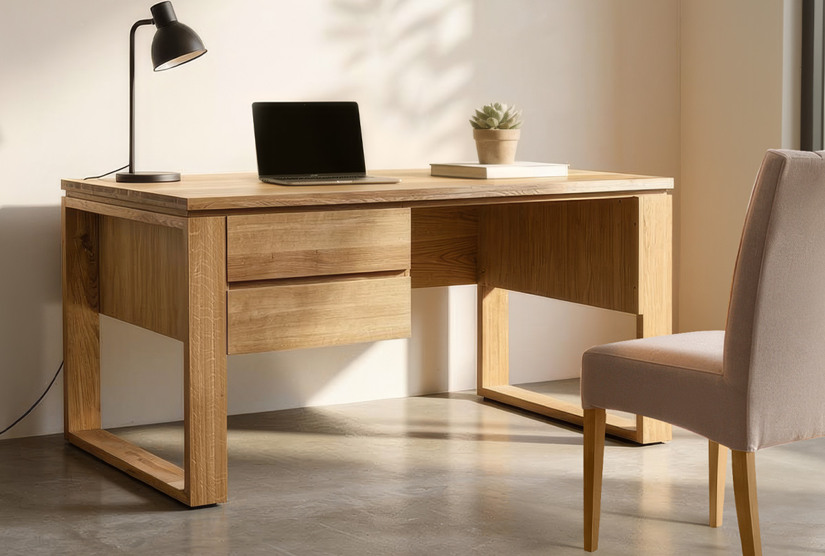 Письменный стол «Берген» В в цвете «бейц-масло» из массива и шпона дуба прекрасно впишется, как в домашний кабинет, так и в детскую или комнату подростка.