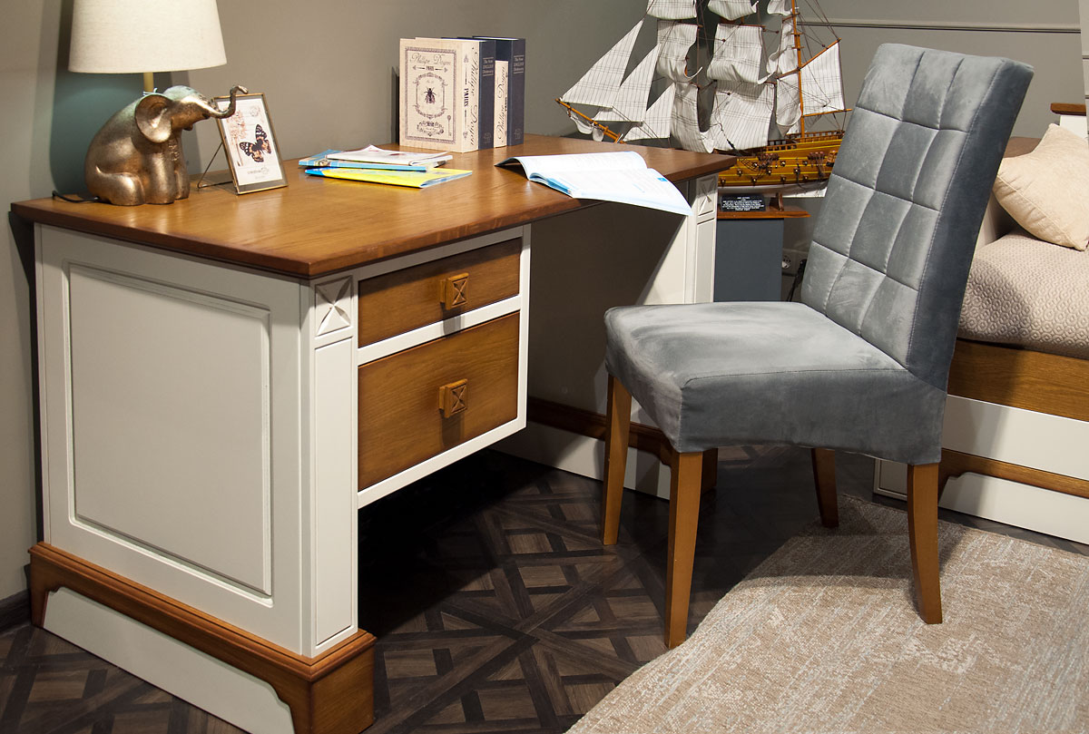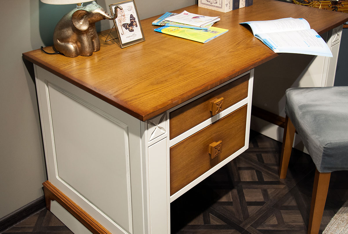 Письменный стол Brianson с одной тумбой слева – добротный и стильный, сочетает в себе оригинальный дизайн и практичность выполнен из массива и шпона дуба, тонированный в оттенок: «жемчуг+дуб». Стол «Бриансон» оснащен двумя выдвижными вместительными ящиками с направляющими полного выдвижения.