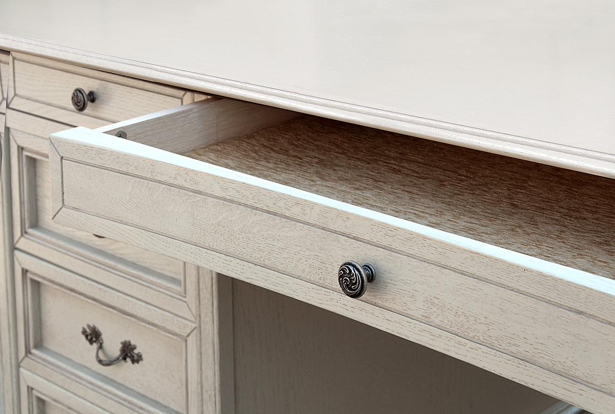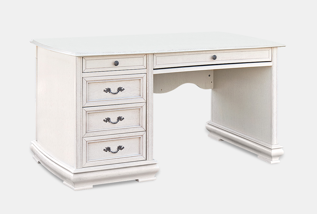 Письменный стол «кОскар» в цвете «белая эмаль с темной патиной» с одной тумбой слева исполнен в классическом стиле и прекрасно впишется в интерьер домашнего кабинета. Благодаря массиву дуба стол выглядит основательно и настраивает на полную сосредоточенность, а работа за ним приносит истинное удовольствие. Выдвижные ящички радуют мягкой велюровой отделкой, а доставать предметы из них удобно как правшам, так и левшам, поскольку стол выполнен в двух конфигурациях: с тумбой справа и с тумбой слева.