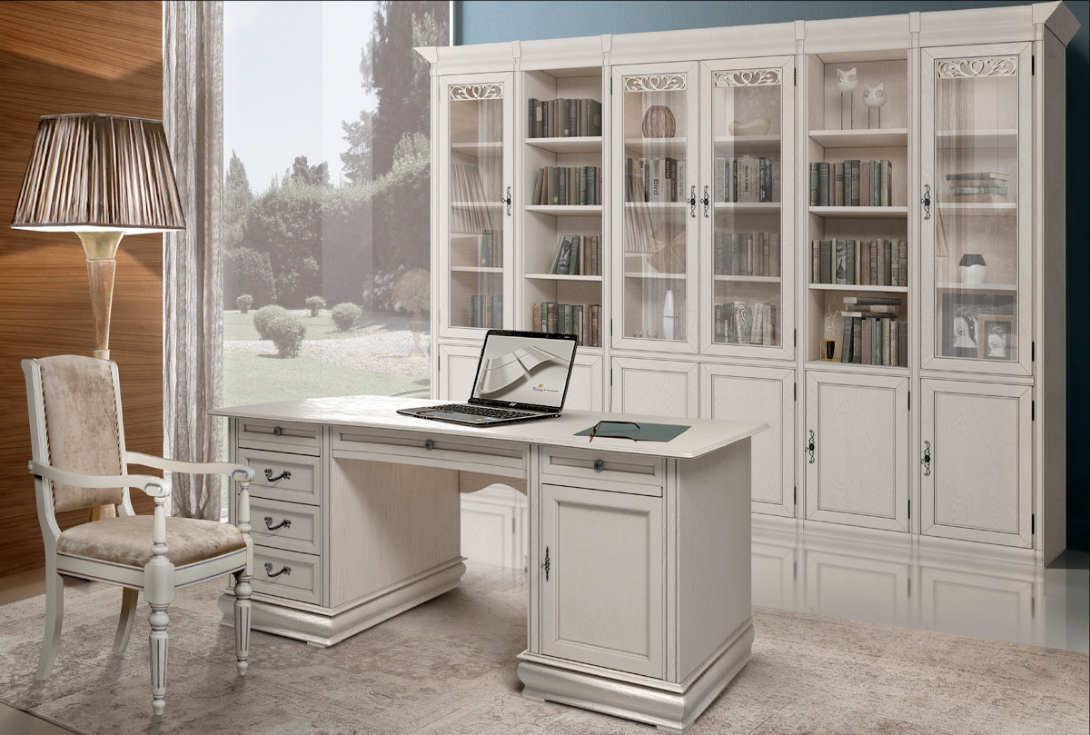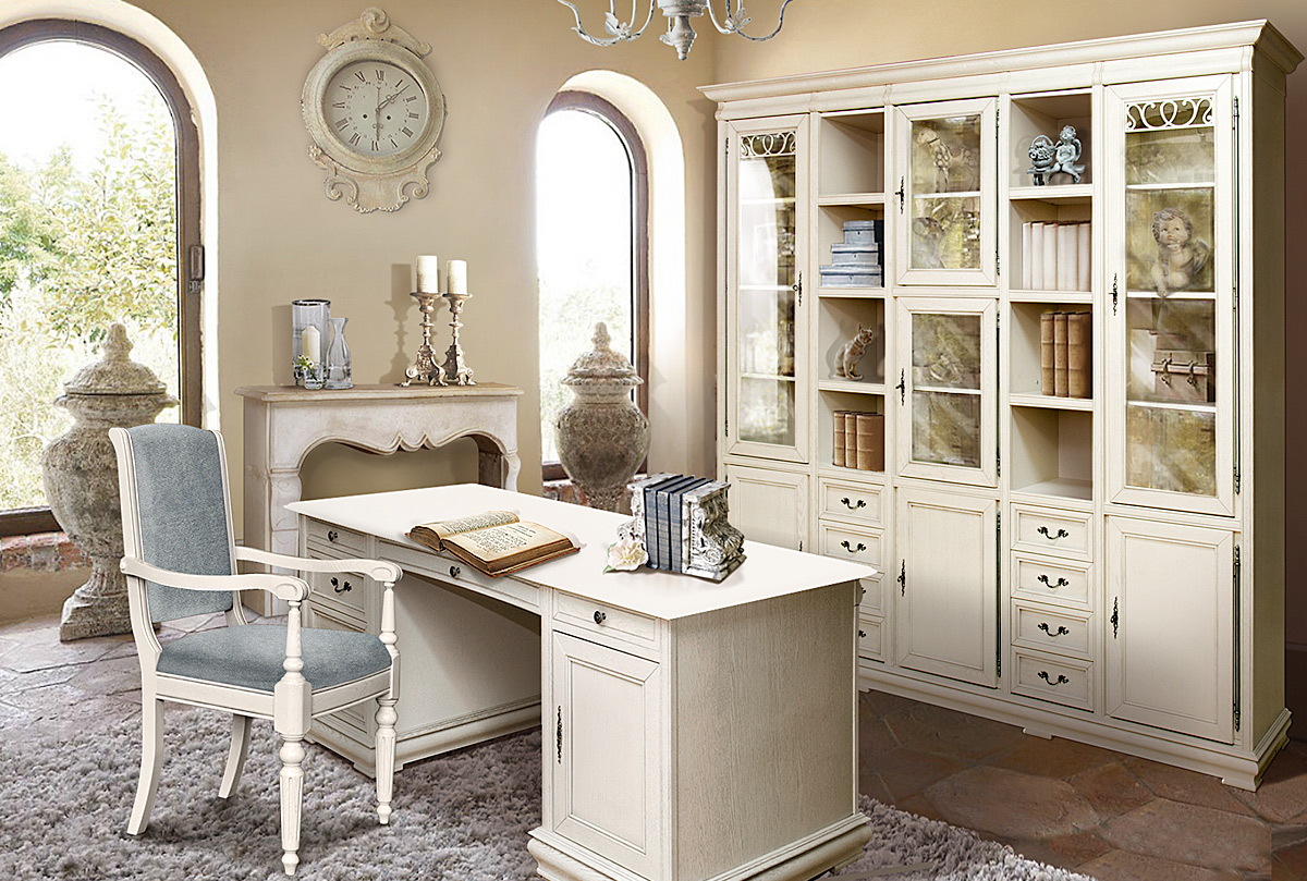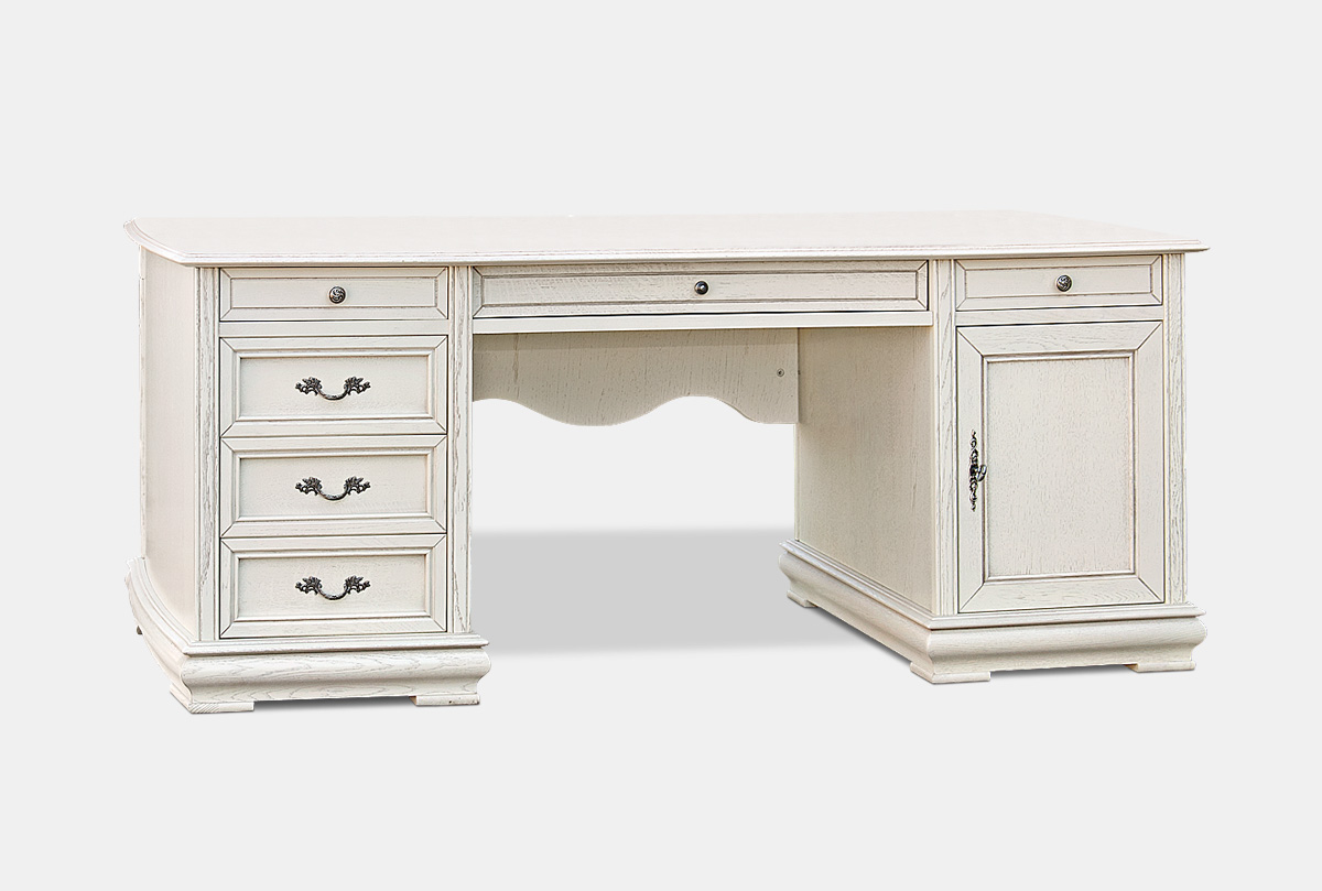 Настоящей изюминкой домашнего кабинета может стать письменный стол «Оскар» с двумя тумбами в цвете «белая эмаль с темной патиной». Натуральная фактура дуба, тонкие оттенки цветовой гаммы ;придают столу поистине аристократичный вид. На представительной дубовой столешнице гармонично смотрятся и современные гаджеты и раритетные письменные принадлежности. Дно ящиков обращает на себя внимание великолепной велюровой отделкой.