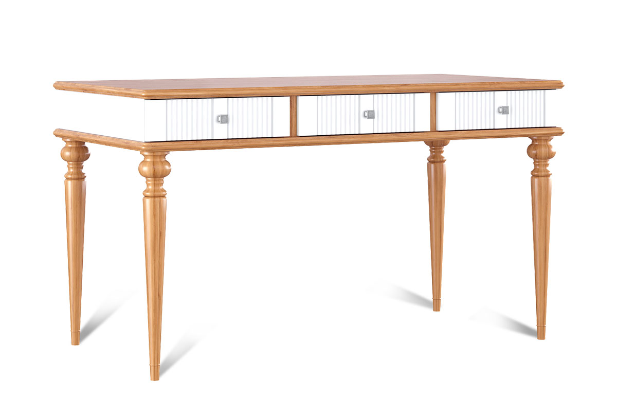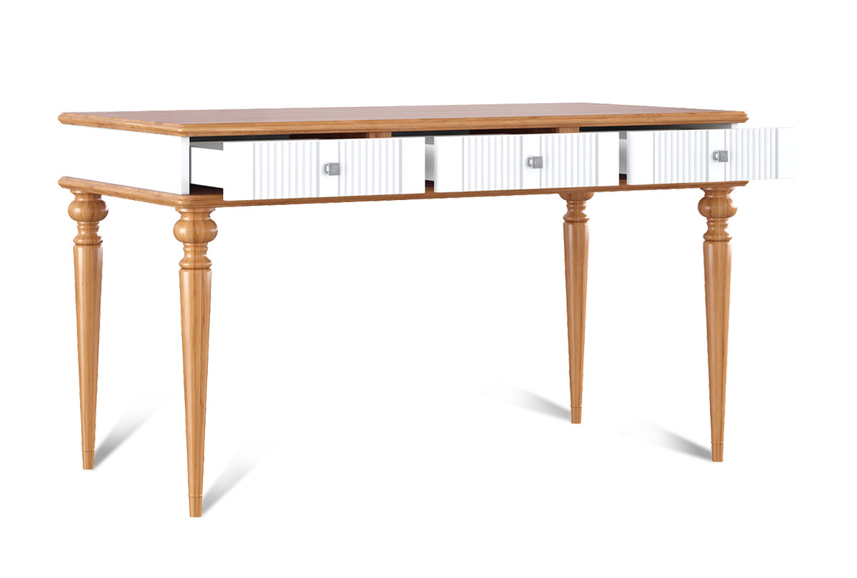 Стол письменный «Рандеву» 003. Размеры (ШxВxГ) 1365 x 777 x 700 мм. Классический письменный стол из коллекции «Рандеву» для поклонников светлых интерьеров. Широкая удобная столешница подойдет для работы за компьютером. Под ней расположено три выдвижных ящика для канцтоваров, документов и разных мелочей. Все детали сделаны из натурального массива дерева, что обеспечивает их прочность и надежность. Отличное приобретение для личного кабинета, гостиной или спальни. Широкая столешница удобна как для работы за компьютером, так и для рисования и другого ручного труда.