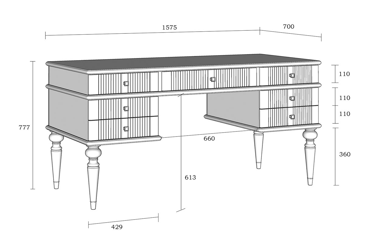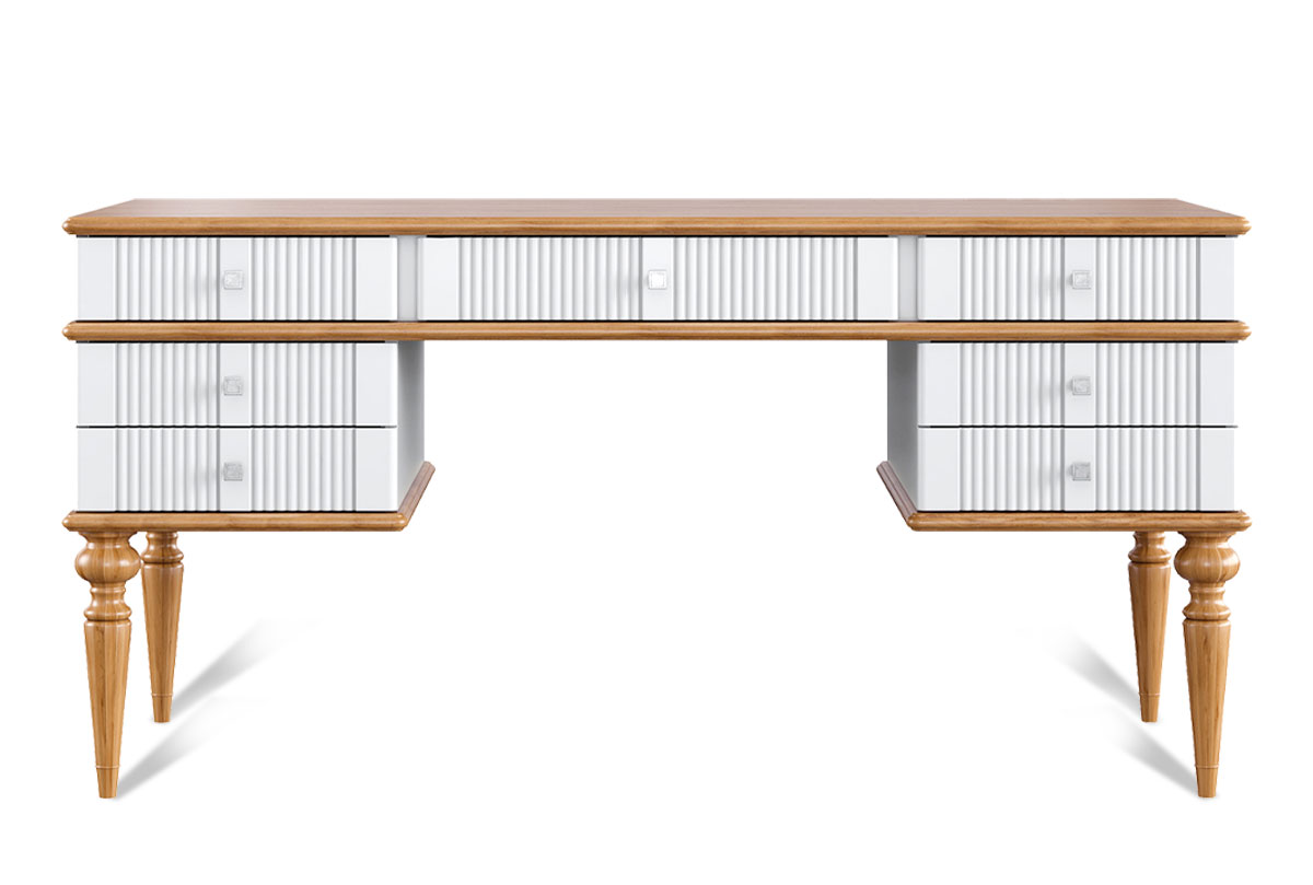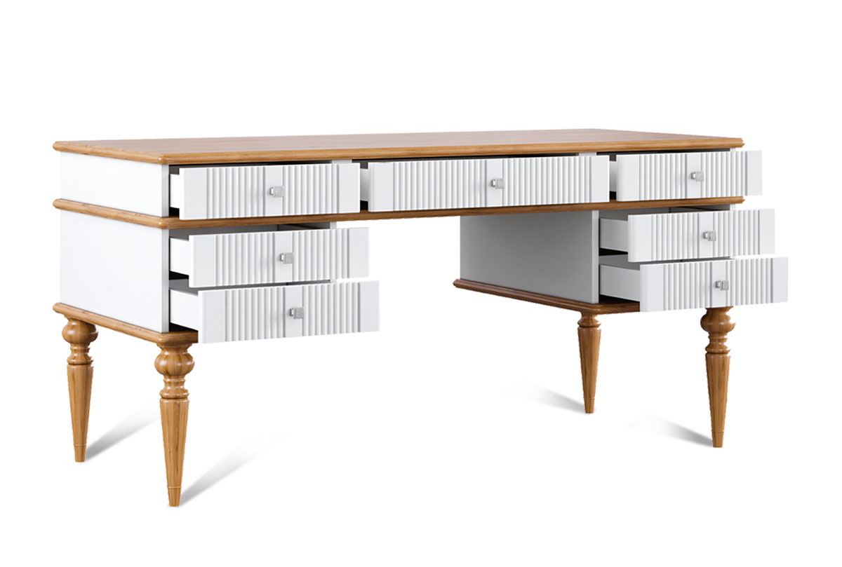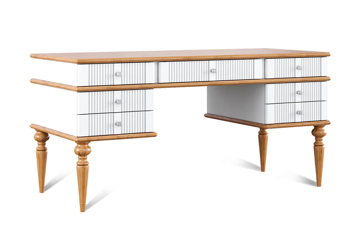 Письменный стол «Рандеву» 07 с двумя тумбами в цвете «белый лак+антик 24». Размеры (ШxВxГ) 1575 x 777 x 700 мм. Классический письменный стол из коллекции «Рандеву» для поклонников светлых интерьеров. Широкая удобная столешница подойдет для работы за компьютером. Под ней расположено семь выдвижных ящиков для канцтоваров, документов и разных мелочей. Все детали сделаны из натурального массива дерева, что обеспечивает их прочность и надежность. Отличное приобретение для личного кабинета, гостиной или спальни. Широкая столешница удобна как для работы за компьютером, так и для рисования и другого ручного труда.