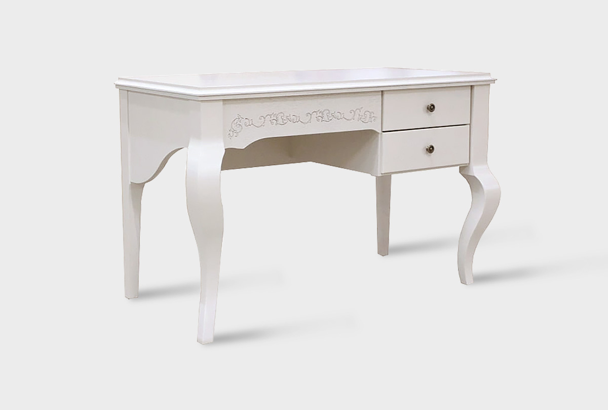 Изысканный письменный стол «Соната» в цвете «белая эмаль с темной патиной», выполненный в классическом стиле, прекрасно впишется в интерьер любой спальни, детской комнаты или кабинета. Благодаря высоким гнутым ножкам и благородным цветам крашения, стол будет смотреться легко и изящно в вашем интерьере. Стол оснащен двумя выдвижными ящиками, где вы сможете удобно разместить письменные принадлежности.