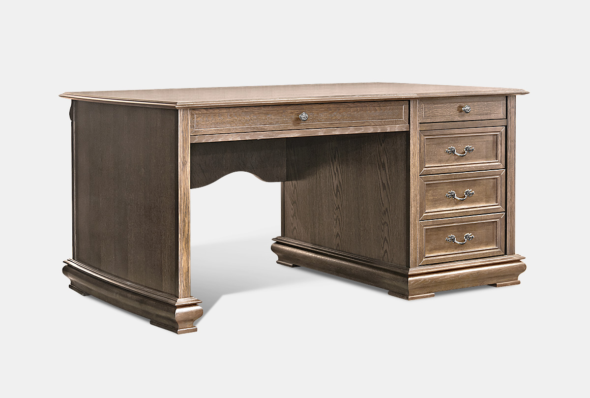 Письменный стол «Тэфи» с одной тумбой справа в цвете «амбэр с белой патиной» исполнен в классическом стиле и прекрасно впишется в интерьер домашнего кабинета. Благодаря массиву дуба стол выглядит основательно и настраивает на полную сосредоточенность, а работа за ним приносит истинное удовольствие. Выдвижные ящички радуют мягкой велюровой отделкой, а доставать предметы из них удобно как правшам, так и левшам, поскольку стол выполнен в двух конфигурациях: с тумбой справа и с тумбой слева.