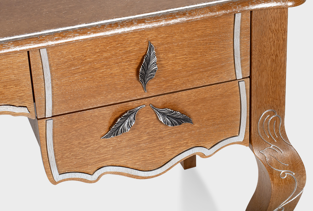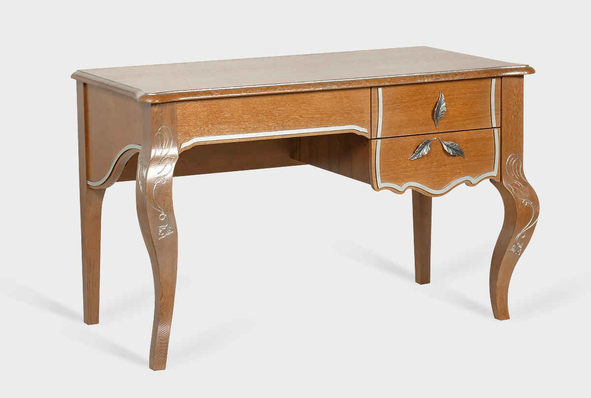 Письменный стол из коллекции «Трио» в цвете «коньяк с серебряной патиной+серебро» выполнен из массива и шпона дуба. Изящный и утонченный он обладает оптимальной глубиной столешницы, за которой вы сможете без труда создать свое рабочее место.