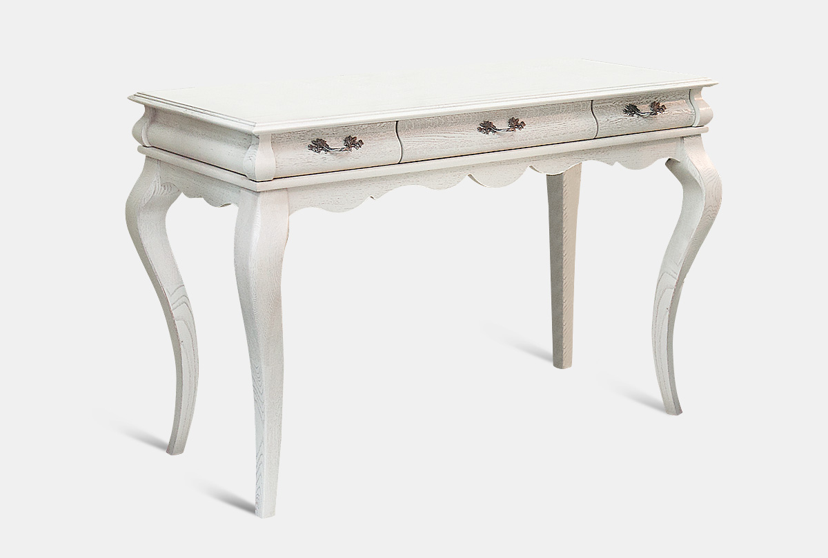 Изящный и утонченный туалетный стол «Тэфи» в цвете «белая эмаль с темной патиной» придется по вкусу любой женщине. Плавные изгибы ног, нарядная юбка в сочетании с массивом благородного дуба, тонированного в один из предложенных цветов – вот истинное очарование современной классики. Стол оснащен тремя выдвижными ящиками, где найдут место все туалетные принадлежности и другие мелочи.