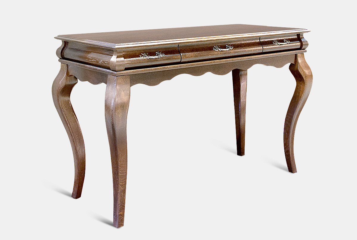 Изящный и утонченный туалетный стол «Тэфи» в цвете «амбэр с белой патиной» придется по вкусу любой женщине. Плавные изгибы ног, нарядная юбка в сочетании с массивом благородного дуба, тонированного в один из предложенных цветов – вот истинное очарование современной классики. Стол оснащен тремя выдвижными ящиками, где найдут место все туалетные принадлежности и другие мелочи.