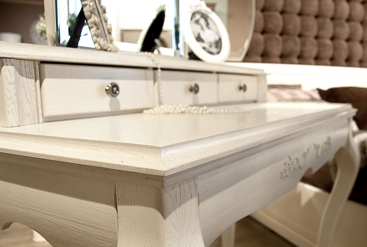 ✅ Изюминку дизайну стола туалетного придает оригинальный объемный рисунок в виде цветочного узора на фасаде ящика и фигурные ножки из массива дуба.
