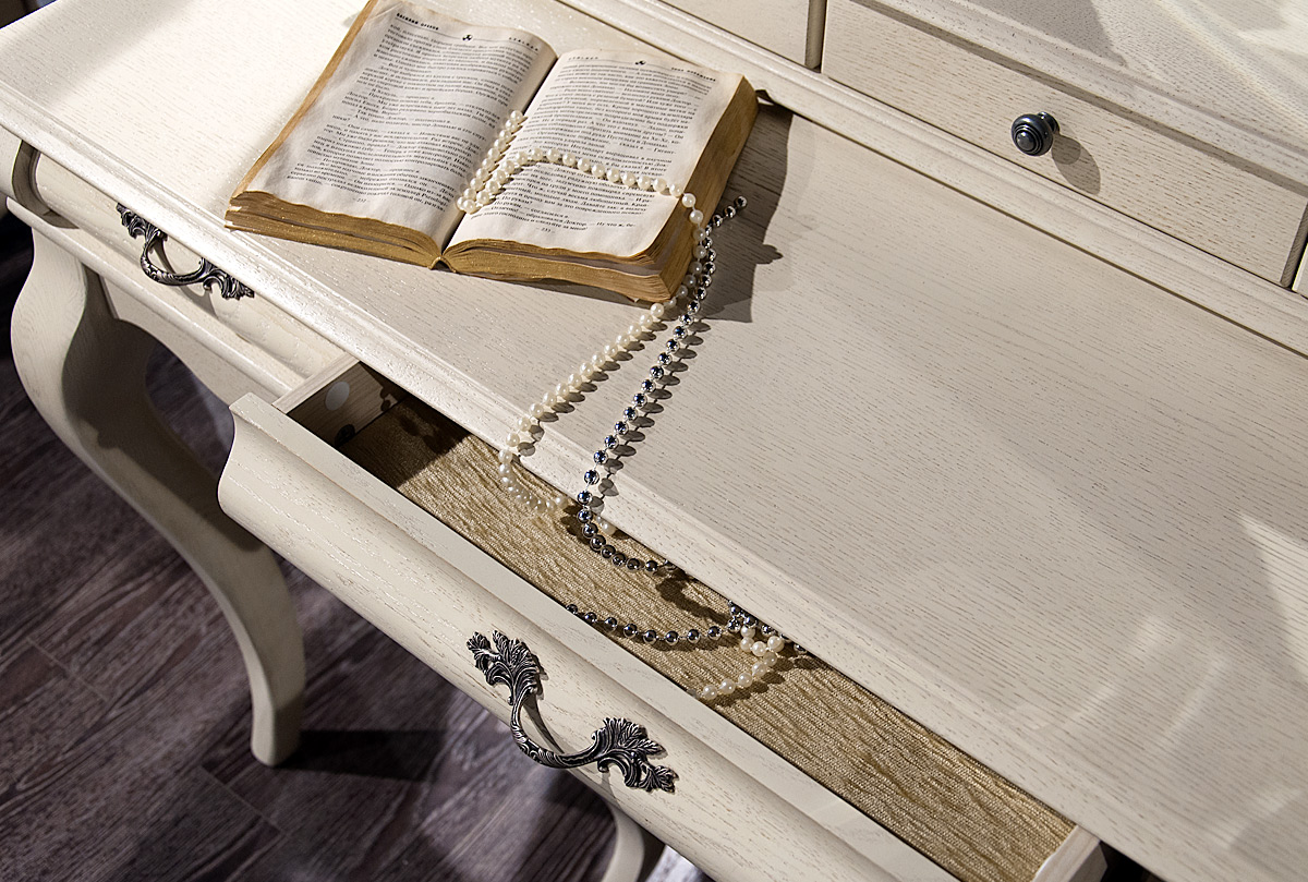 В пространство фешенебельного будуара идеально впишется элегантный туалетный стол с зеркалом «Тэфи» в цвете «белая эмаль с темной патиной». В ящиках, отделанных нежным велюром, найдется место для косметики, бижутерии и ценностей, а ручки изделия украшены затейливым растительным узором. Изготовлен туалетный стол из массива дуба, который оригинально смотрится в разных цветовых решениях.
