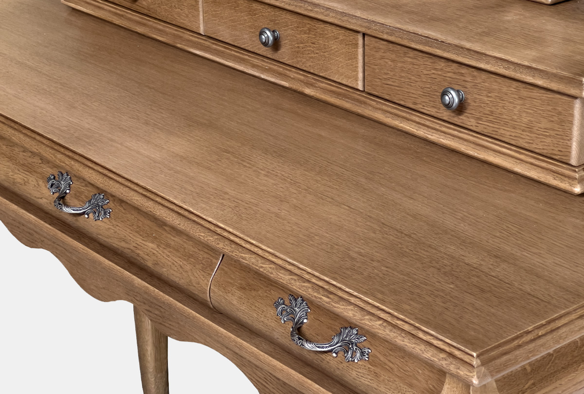 В пространство фешенебельного будуара идеально впишется элегантный туалетный стол с зеркалом «Тэфи» в цвете «классик». В ящиках, отделанных нежным велюром, найдется место для косметики, бижутерии и ценностей, а ручки изделия украшены затейливым растительным узором. Изготовлен туалетный стол из массива дуба, который оригинально смотрится в разных цветовых решениях.