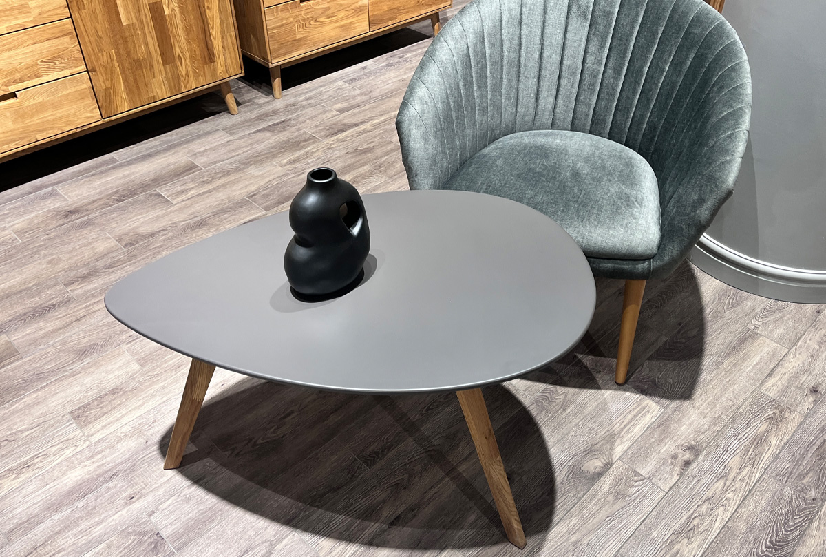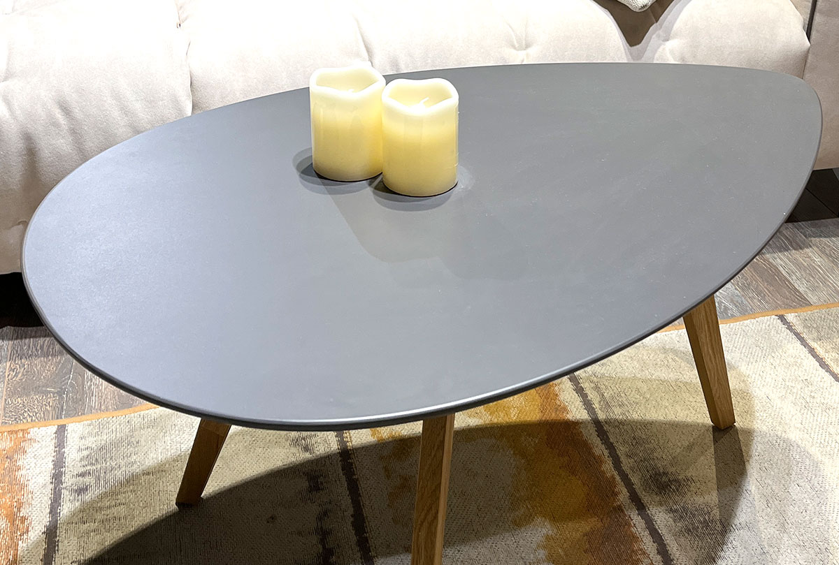 Журнальный стол Wallstreet (капля) в цвете «н-бейц-масло, стл-антрацит» выполнен в современном стиле Лофт с сочетанием текстуры натурального дерева и акцентного цвета стоолешницы.