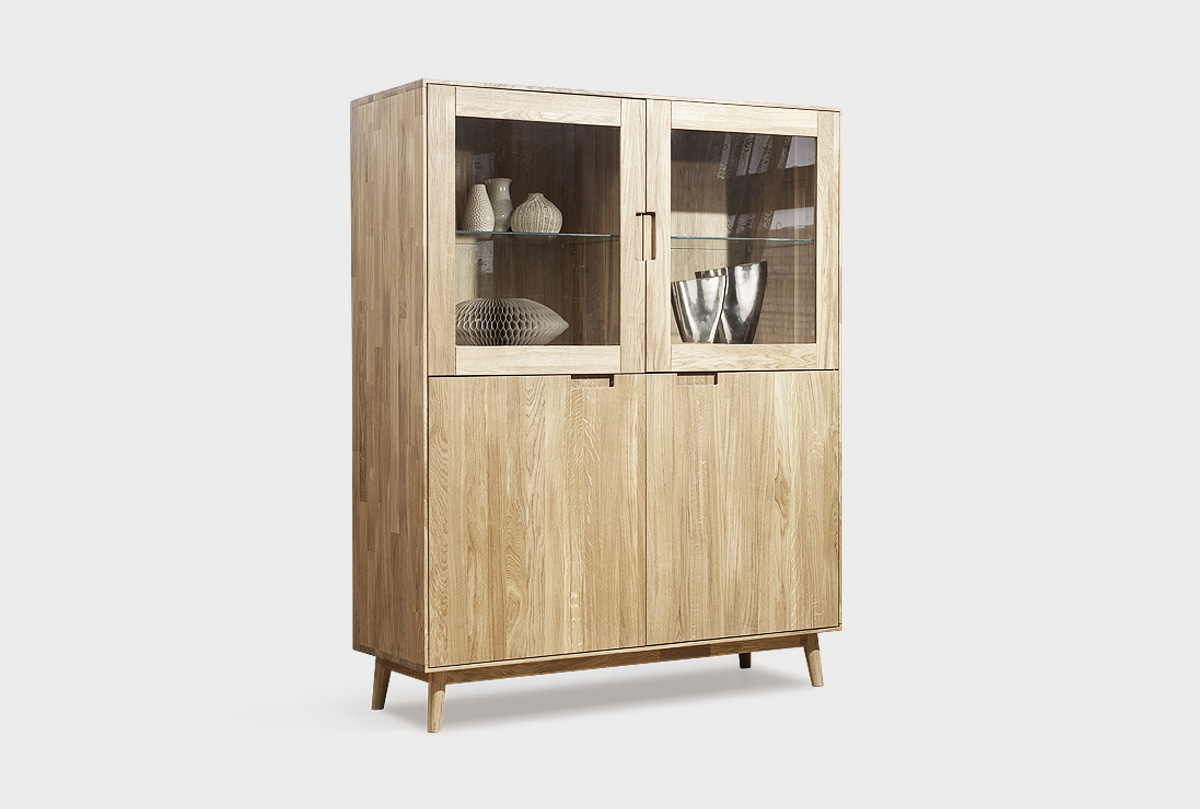 Высокая двухсекционная тумба «Ирвинг»— не просто функциональный элемент, а изящный архитектурный акцент для интерьера. Минималистичная фурнитура заменена интегрированными ручками — срезами в массиве фасадов. Такая деталировка подчёркивает натуральность и эстетику дерева, создавая ощущение цельности. Тонкие скошенные ножки визуально приподнимают конструкцию, добавляя "воздуха" и лёгкости.
