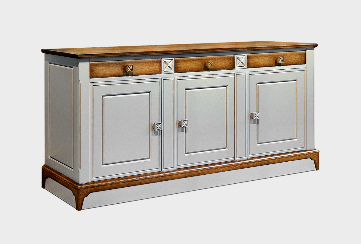 Трехдверная тумба Brianson, в цвете "жемчуг+дуб" отлично подойдет для гостиной или столовой. Тумба оснащена тремя вместительными отделениями с дверцей, а так же выдвижными ящиками. Вы сможете без труда разместить всю кухонную утварь или другие предметы