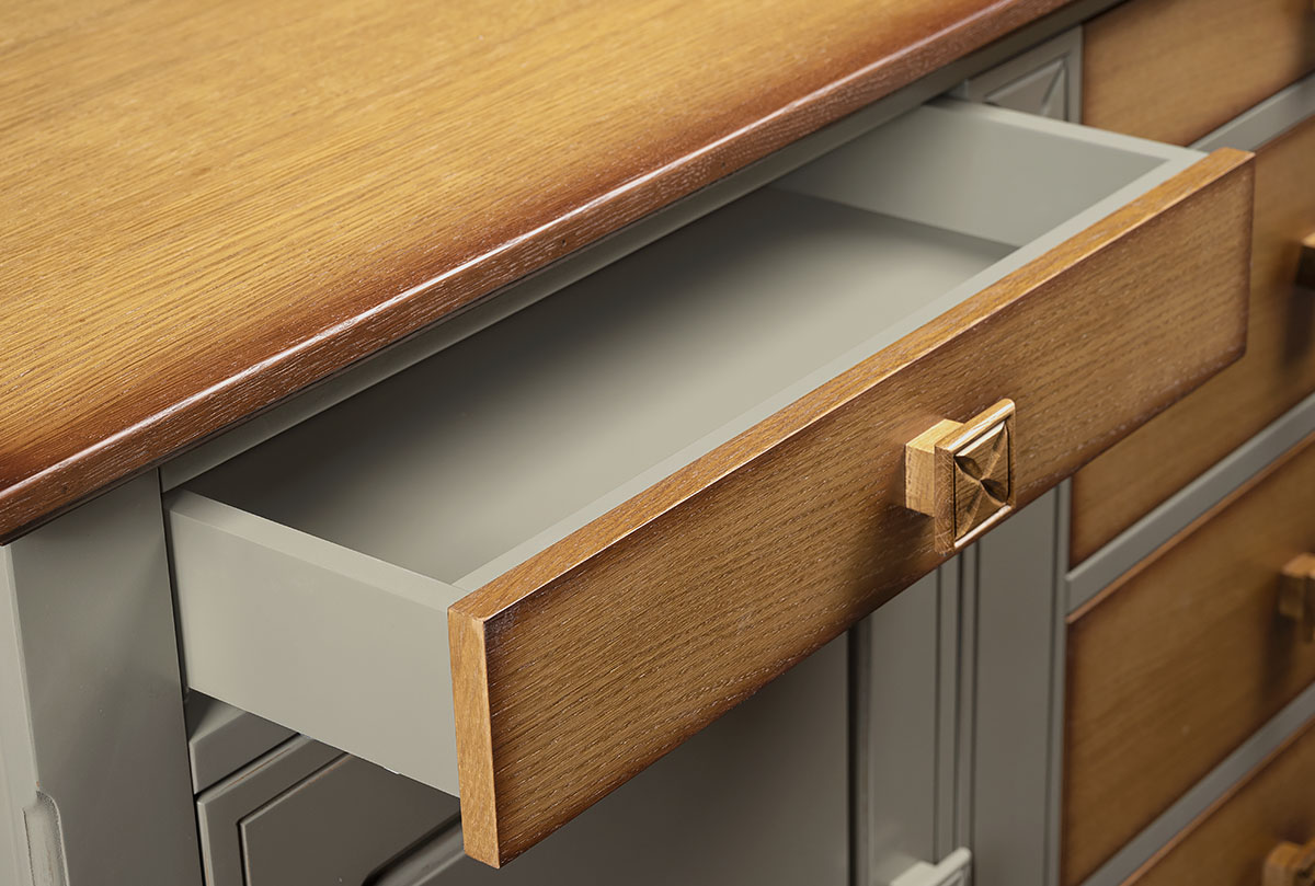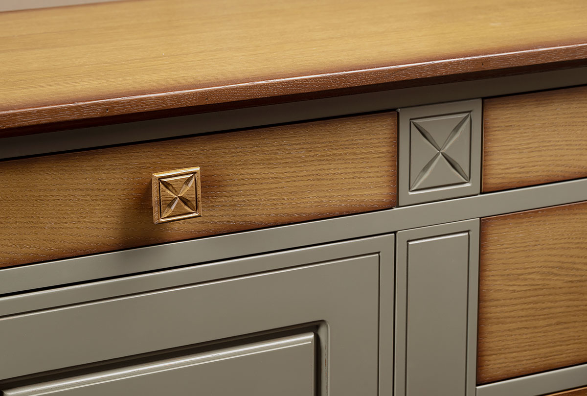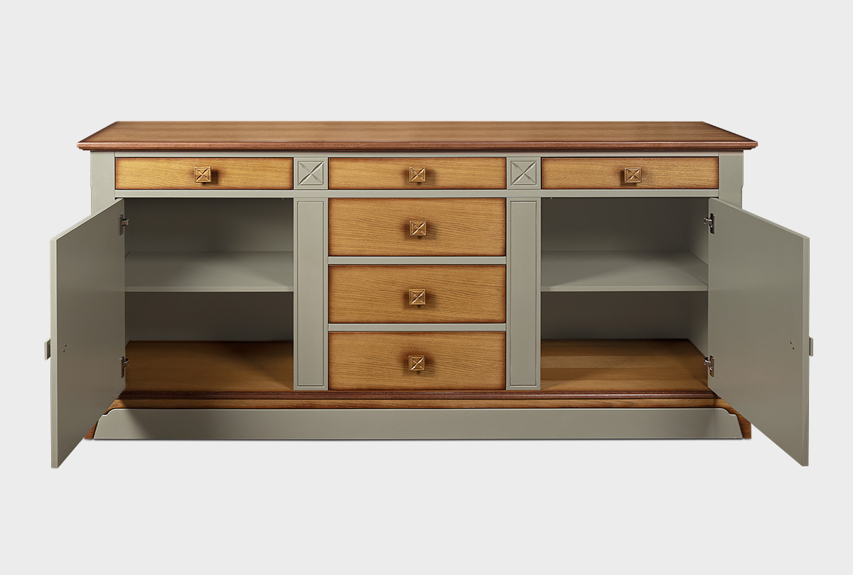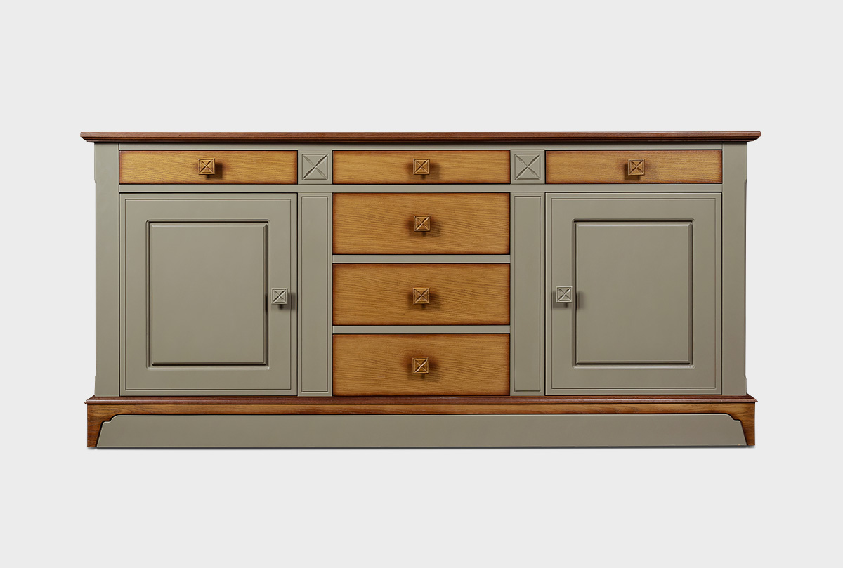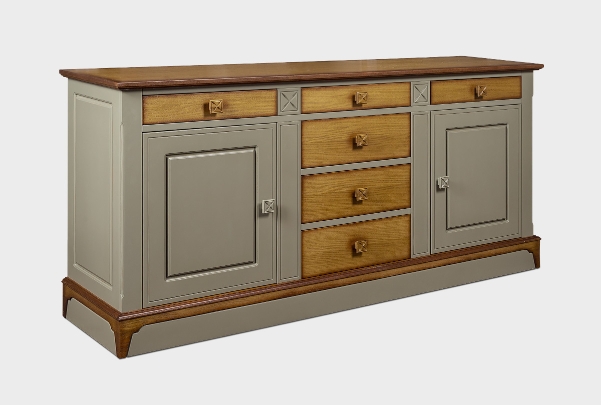 Трехсекционная тумба «Brianson» в цвете «корсика + дуб» — это идеальный выбор для гостиной или столовой. Она оборудована тремя вместительными секциями с дверцами и одной секцией с выдвижными ящиками, что позволит вам удобно разместить всю кухонную утварь или другие необходимые предметы.