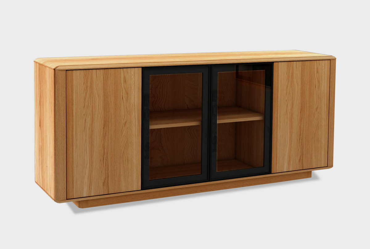 Тумба «Origin» 4-х дверная сочетает в себе эстетику лёгкости и практичность хранения. Центральные стеклянные фасады в матово-чёрной рамке добавляют глубину и контраст, раскрывая внутреннее пространство для декора или сервиза. Глухие боковые двери сохраняют визуальную чистоту формы, а пропорции изделия создают ощущение устойчивости и целостности.