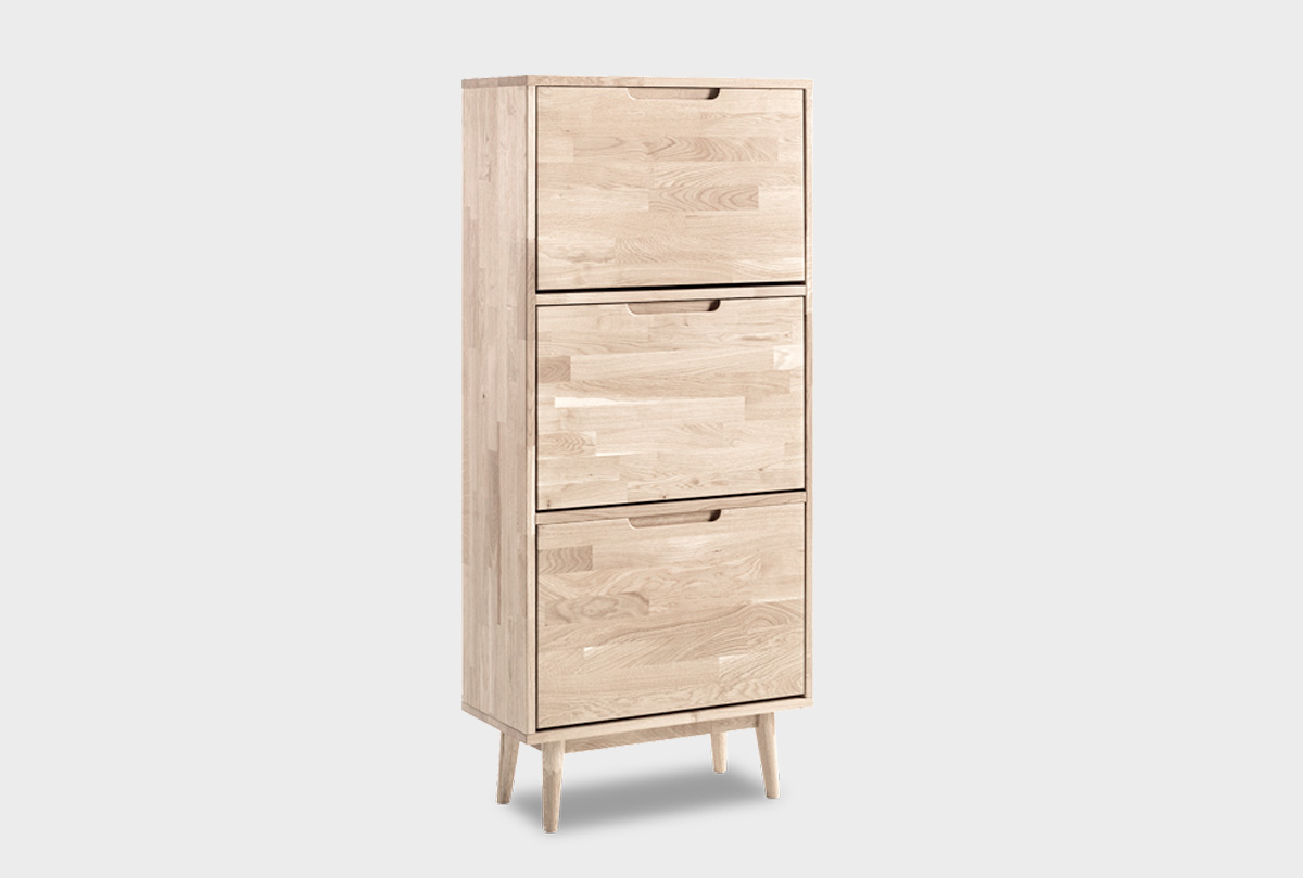 ✅ Три откидных секции на фасаде раскрываются внутрь корпуса, открывая доступ к вместительным отсекам для хранения обуви.