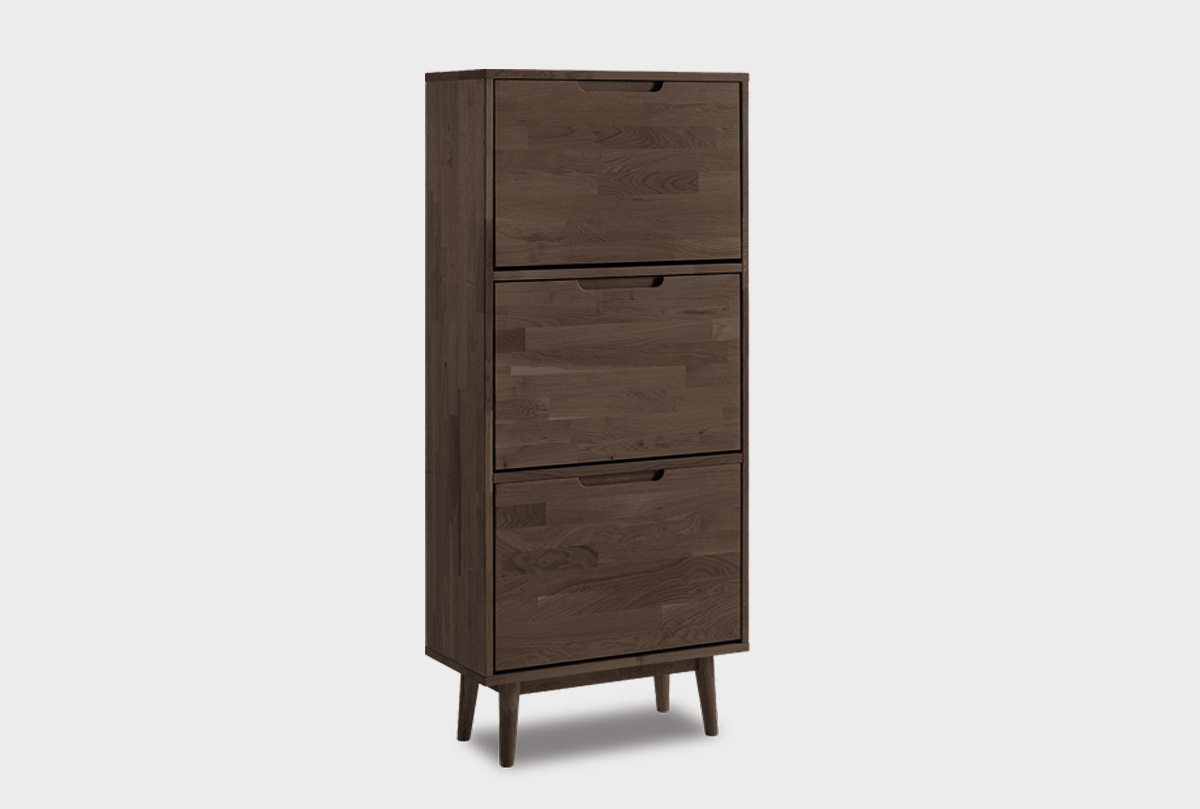 ✅ Три откидных секции на фасаде раскрываются внутрь корпуса, открывая доступ к вместительным отсекам для хранения обуви.