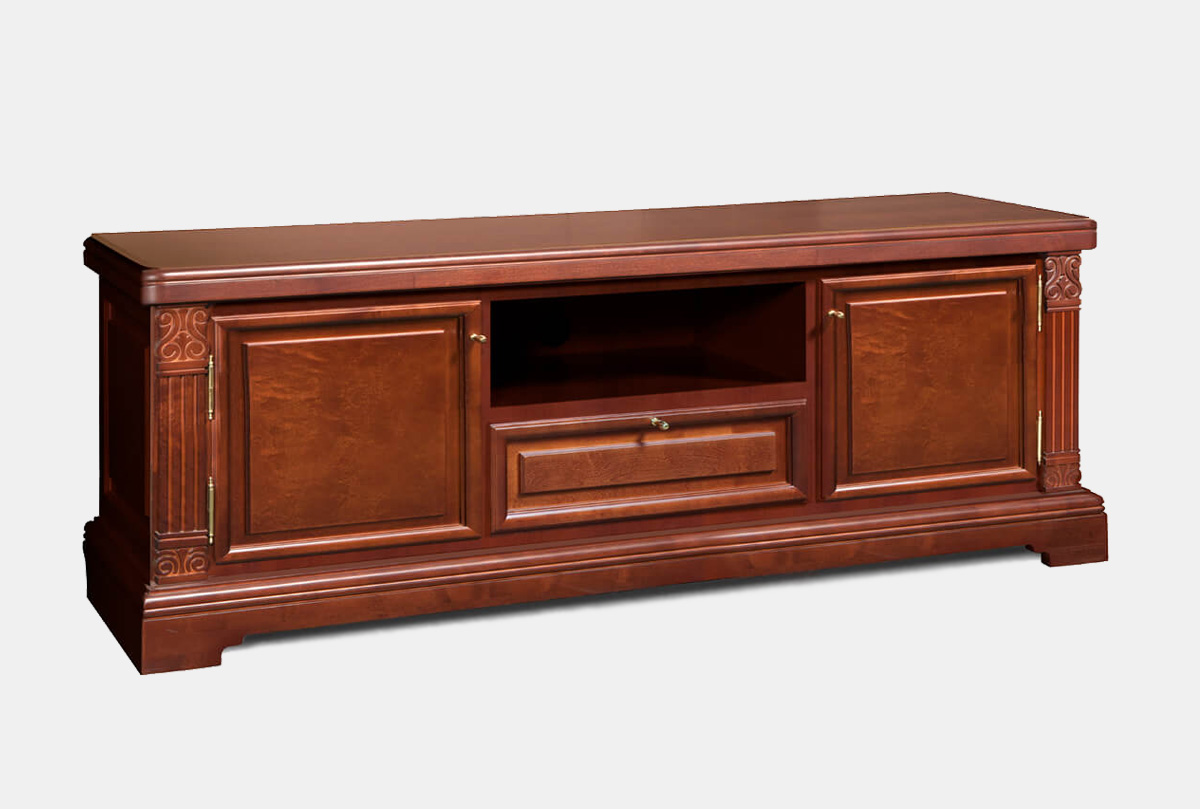 Выполненная из массива берёзы, тумба под ТВ "Престиж" 57 прекрасно впишется в гостиную любого дома или квартиры. Она достаточно изящна, и даже внушительный вид не придает ей громоздкости. Тумба в классическом стиле является настоящим произведением искусства. Сверху достаточно места для современного телевизора, а в специально предусмотренных нишах можно удобно разместить всю аудио- и видеоаппаратуру. Два ящика в нижней части предназначены для хранения дисков и различных мелочей.