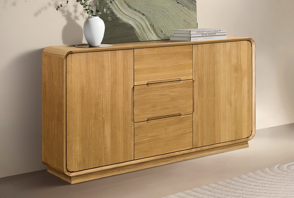 Тумба «Монблан» 3 в цвете «бейц-масло» — воплощение эко-минимализма в практичном формате. Благодаря трём центральным выдвижным ящикам и двум боковым отделениям с полками, она легко справится с организацией хранения в гостиной, спальне или столовой. Геометрически выверенный силуэт и утопленные ручки создают ощущение чистоты и порядка, а плавно скруглённые углы добавляют мягкости и безопасности.
