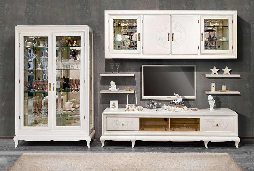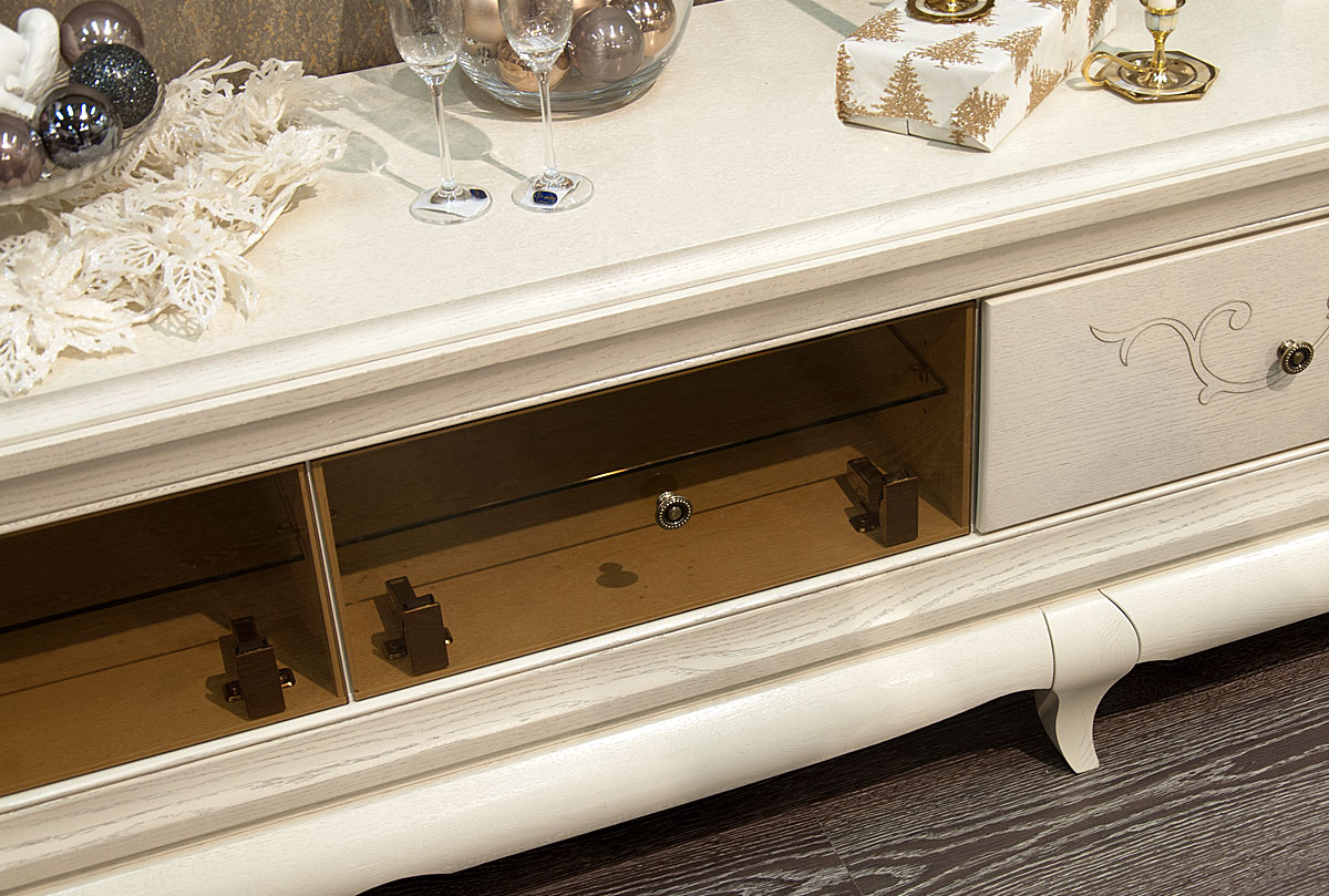 Четырехсекционная тумба под ТВ «Соната» (Sonata) в цвете «белая эмаль с темной патиной» идеально впишется в интерьер гостиной в итальянском стиле. Изготовленная из массива и шпона дуба и окрашенная в классические цвета «коньяк с темной патиной + горький шоколад», «белая эмаль с тёмной патиной», она непременно займет место не только в доме, но и в Вашем сердце. Инкрустации в виде цветочного узора гармонично дополняет «образ», а открытая вместительная ниша для техники, завершают оформление этой тумбы.