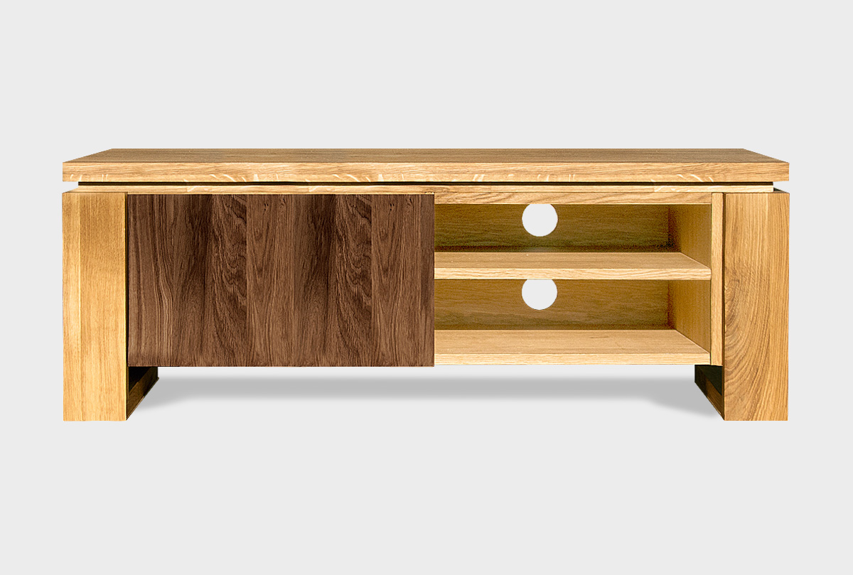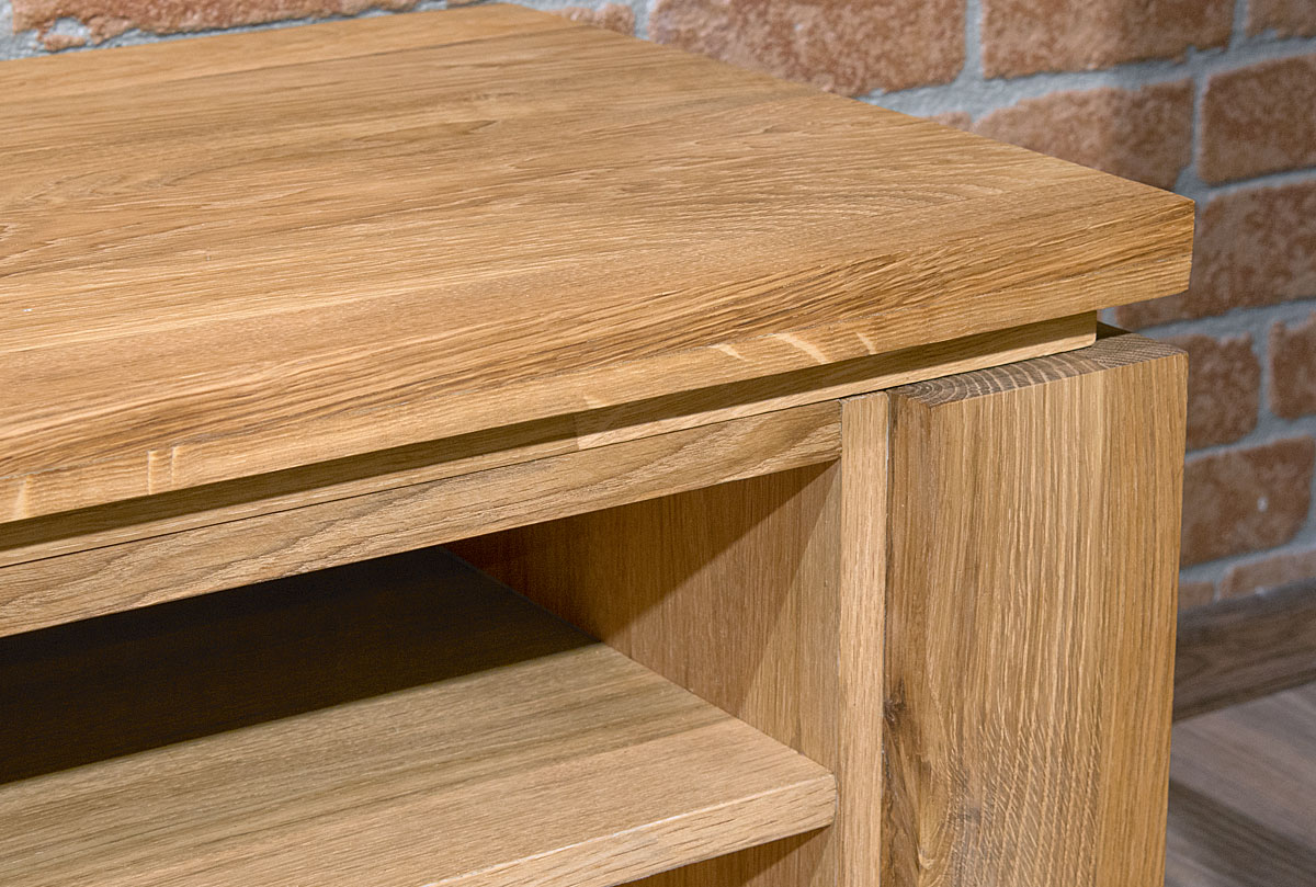 Еще один представитель коллекции в стиле Лофт - тумба под ТВ «Берген» В-120 в цвете «бейц-масло, графит». Идеальный баланс заключен в простоте её открытых полок для видео- и аудиоаппаратуры и в минимализме дверцы, которая закрывает правую половину изделия. А два отверстия в задней стенке тумбы позволят спрятать провода от аппаратуры. Тумба сделана из натурального массива дуба, обработанного бейц-маслом. Такая отделка экологична и максимально сохраняет связь с природой.