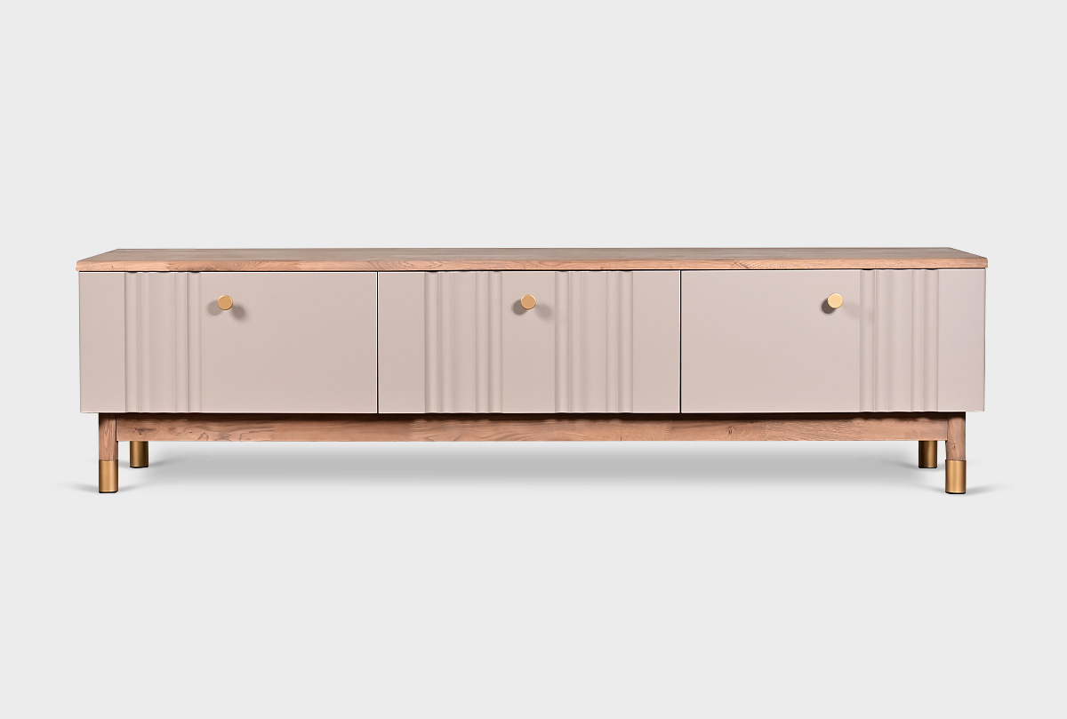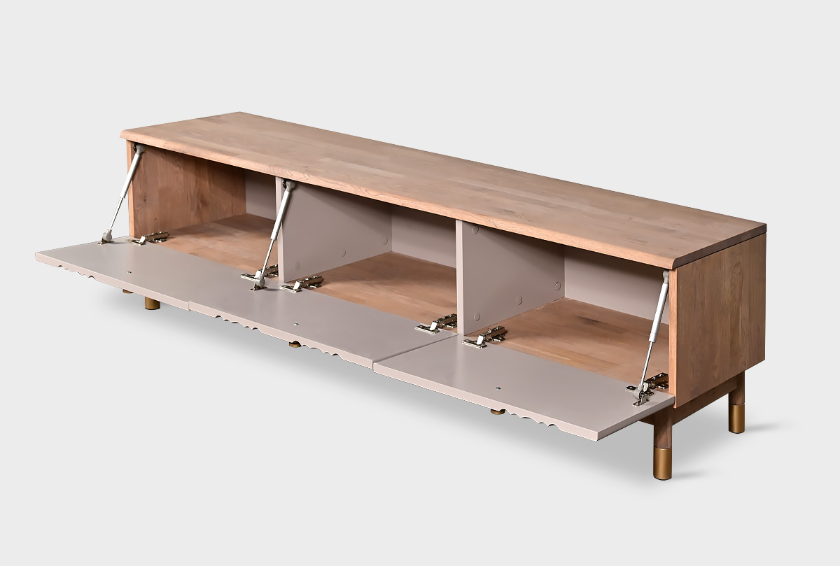 Тумба «Меридиан» 180 визуально вытягивает горизонт, уравновешивая композицию стены с телевизором. Она прекрасно смотрится как в светлом, так и в тёмном интерьере, придавая зоне отдыха ощущение завершённости. Высокие ножки визуально облегчают конструкцию, а волнообразный фасад добавляет декоративности даже при выключенном экране.
