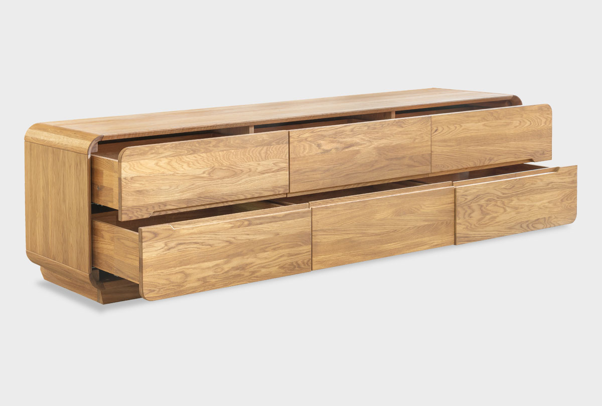✅ Изделие оснащено 6 вместительными выдвижными ящиками, в которых удобно хранить кабели, пульты, журналы, диски или даже текстиль. Глубина ящиков — 385 мм.